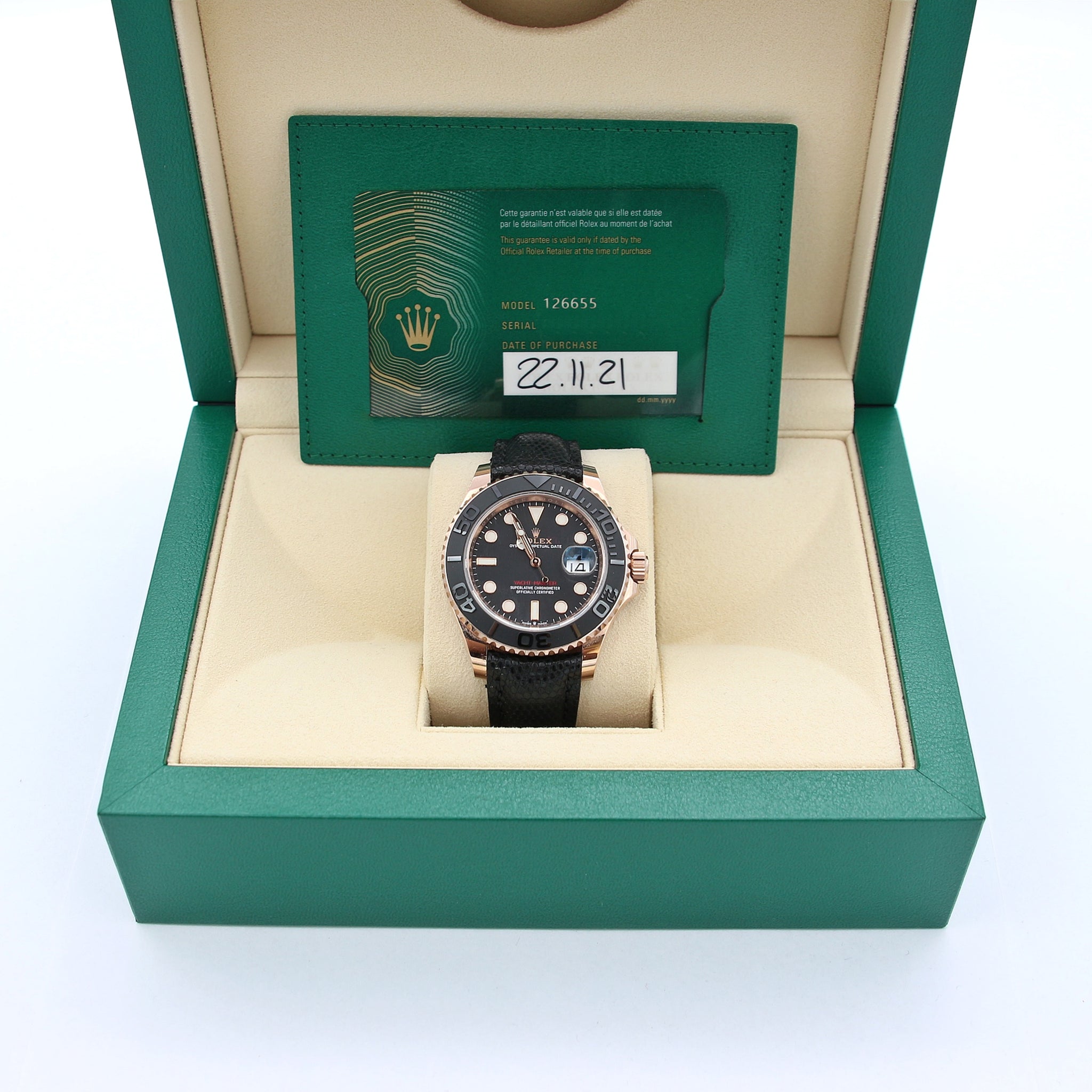 Pre-owned Rolex Yacht-Master ref 126655 (2021) with Everose Oyster case, full set, with generic leather strap.