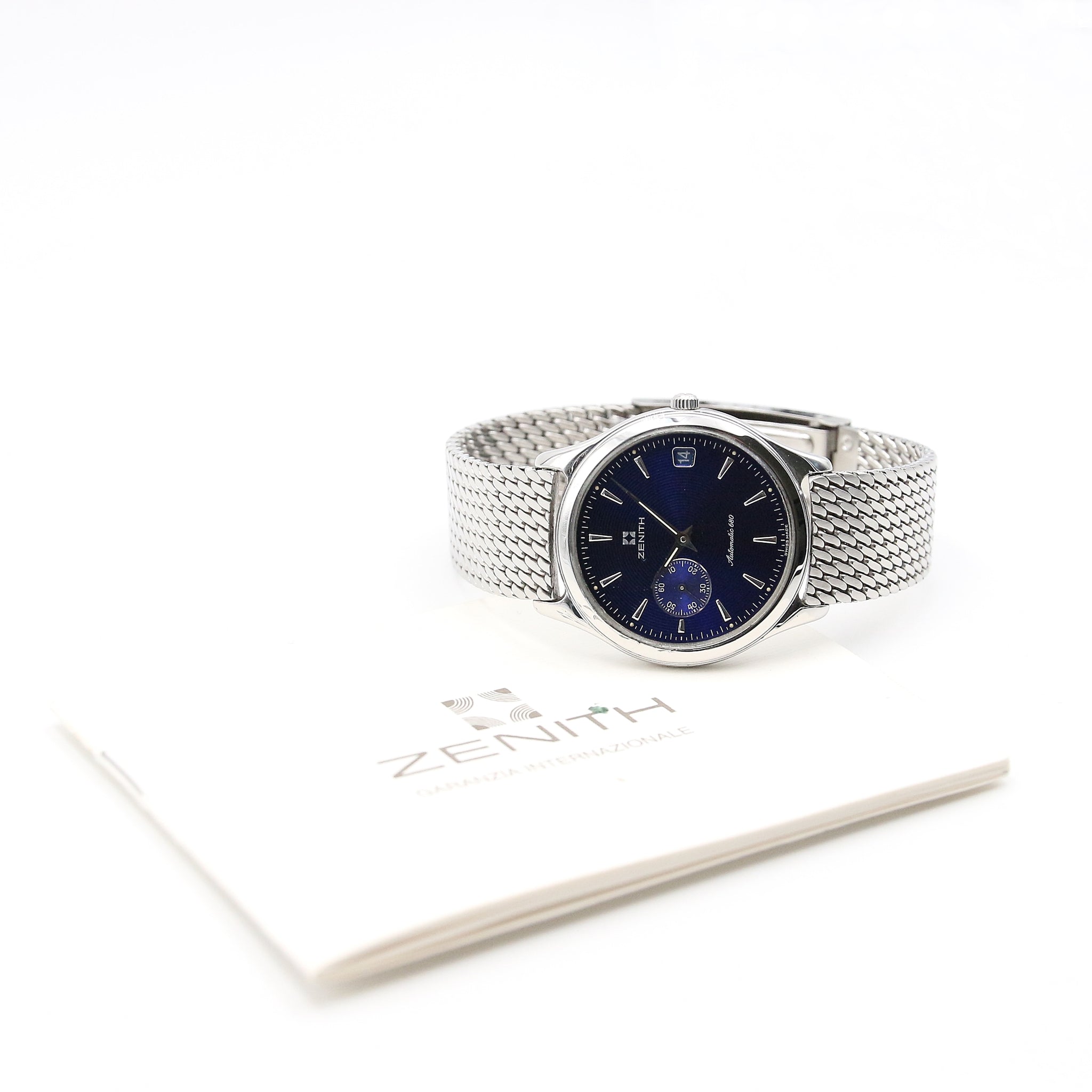 This Zenith Elite Automatic Small Seconds 30.0040.680 features a 36mm steel case surrounding a blue dial on a mesh steel bracelet.
