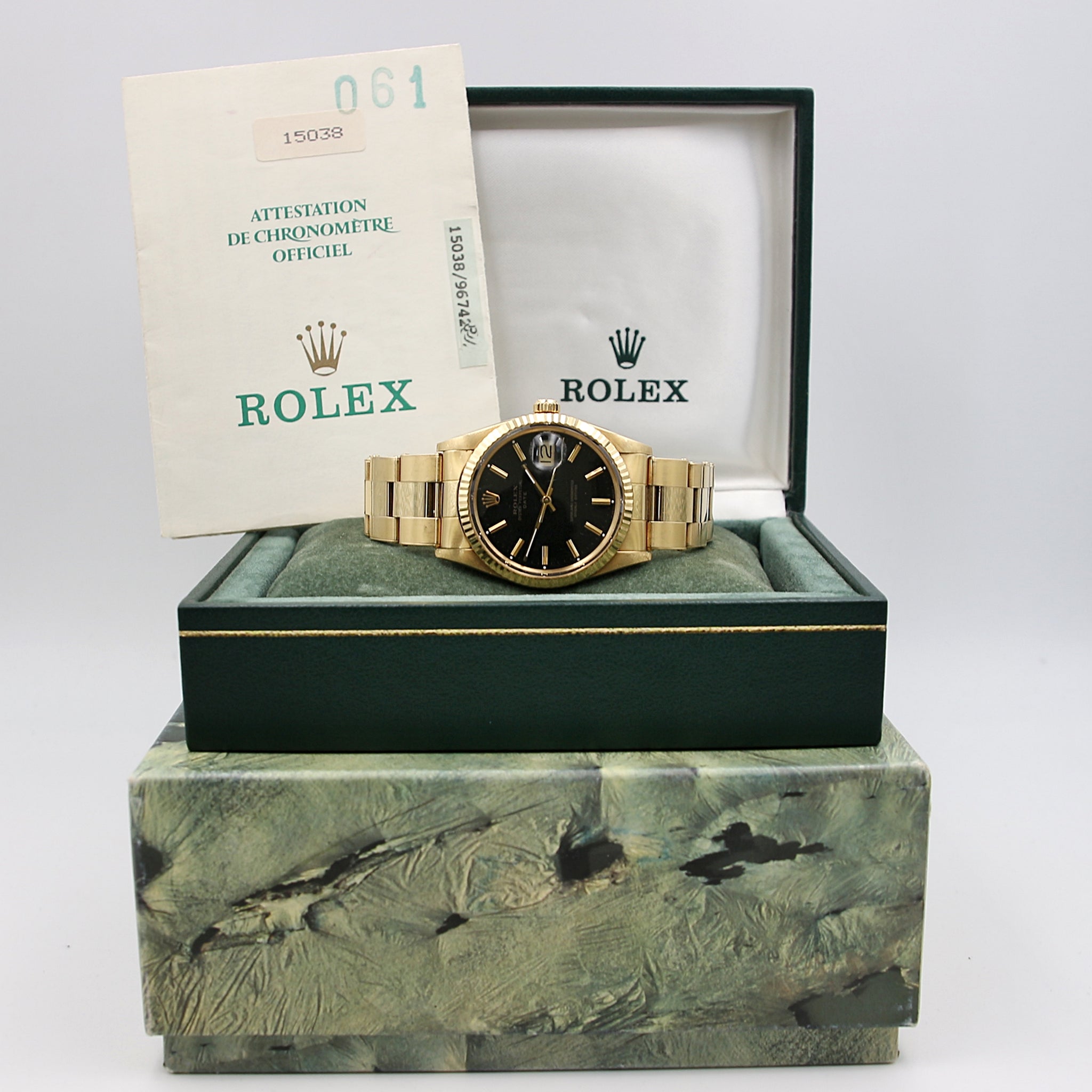 For sale a pre-owned Rolex Date Gold ref. 15038 with original box and papers.