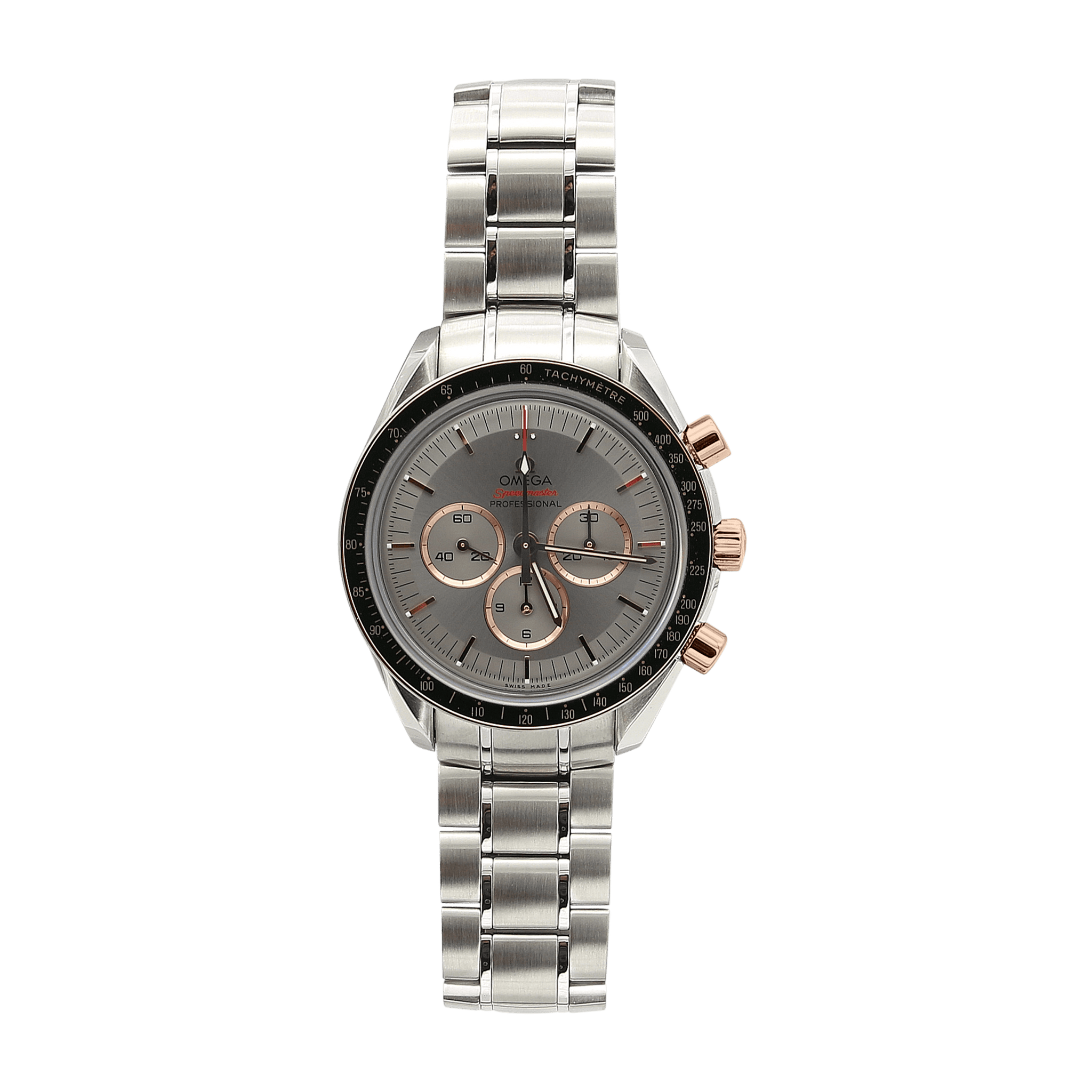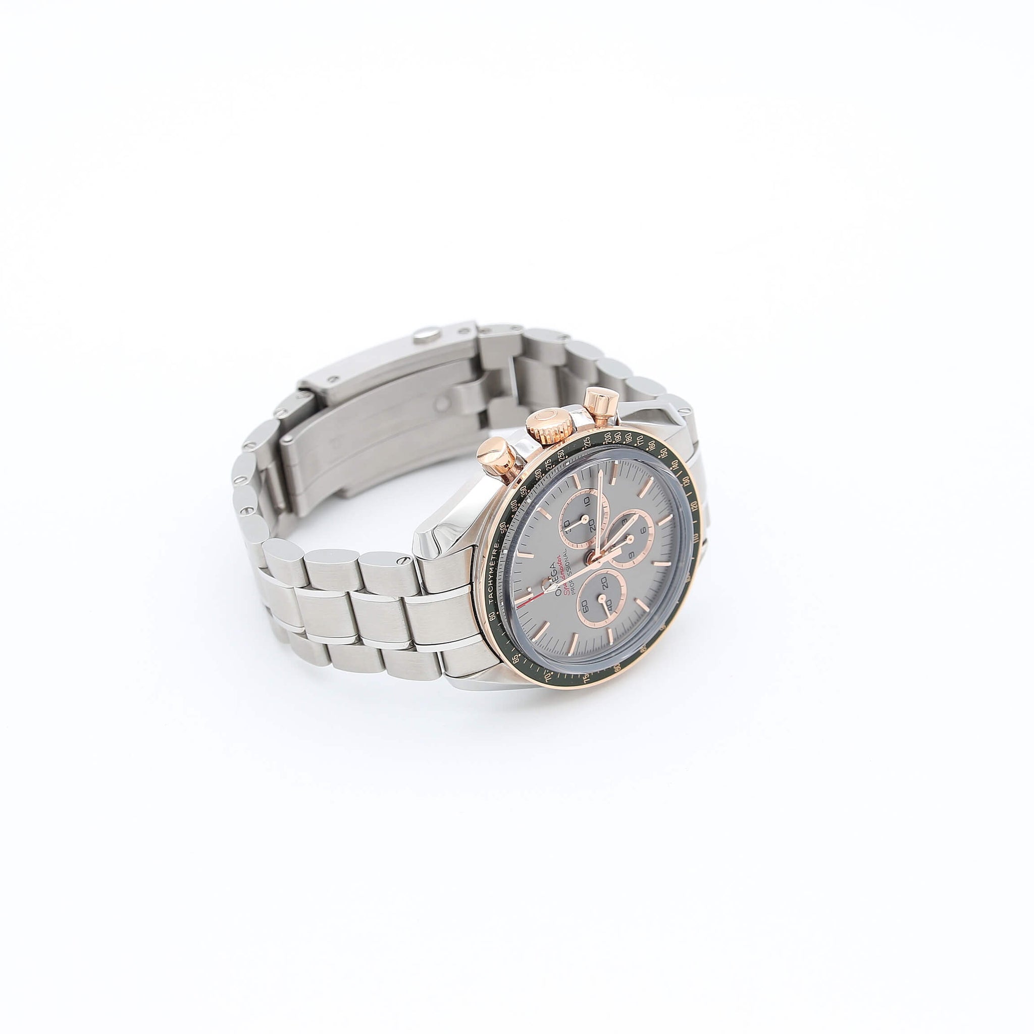 Presented on a stainless steel bracelet, the 42 mm case has been created in stainless steel and 18K yellow gold. The same 18K yellow gold is used for the OMEGA logo, the hands and applied bevelled indexes, as well as the three subdial rings which are positioned on the sun-brushed black dial. There is also an anthracite minute track.