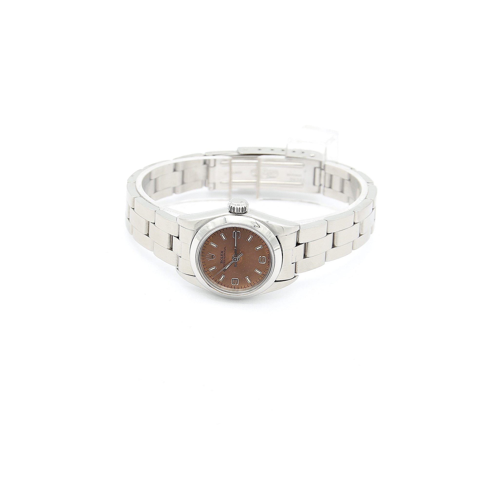 This pre-owned women's Rolex Oyster Perpetual 76080 wristwatch features a brilliant salmon dial with 3-6-9 numerals and sapphire crystal. 26mm in dimension.