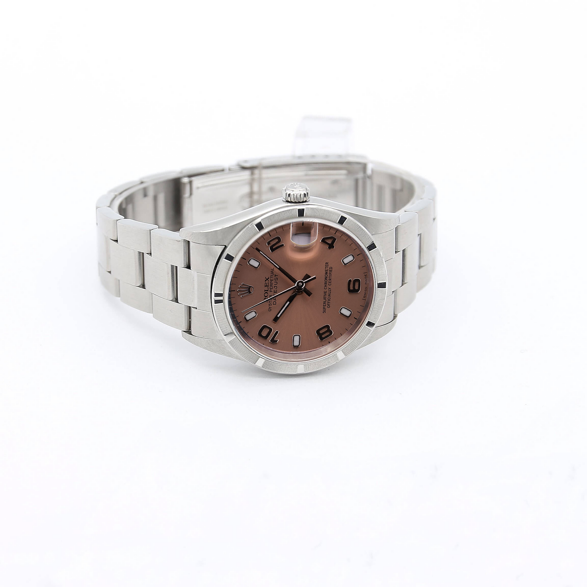 For sale: pre-owned Rolex Date ref. 15210 with salmon dial with arabic numbers, on an oyster bracelet, full set.