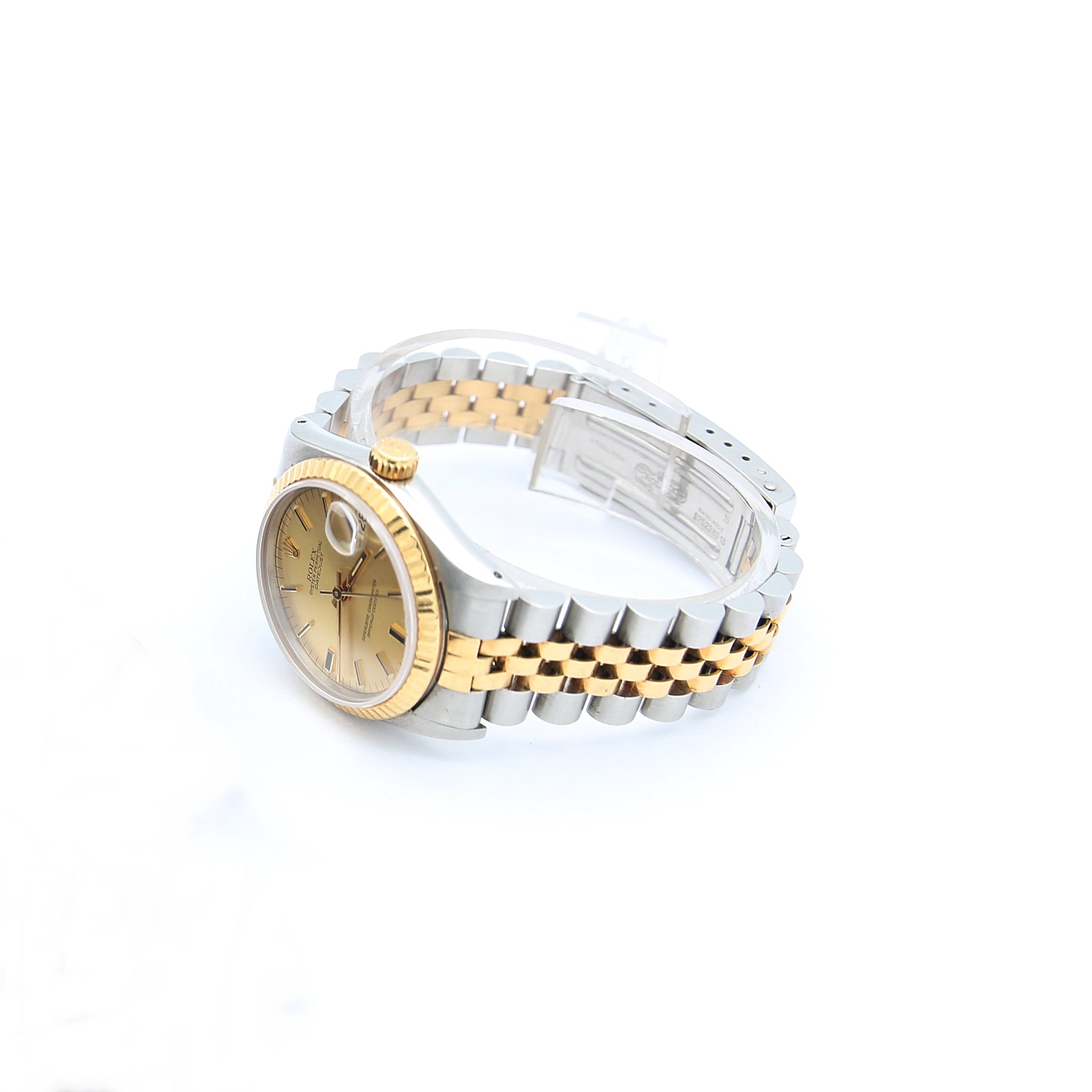 This elegant Rolex features a steel and yellow gold Jubilee bracelet, a matching case in stainless steel, and a yellow gold fluted bezel.
