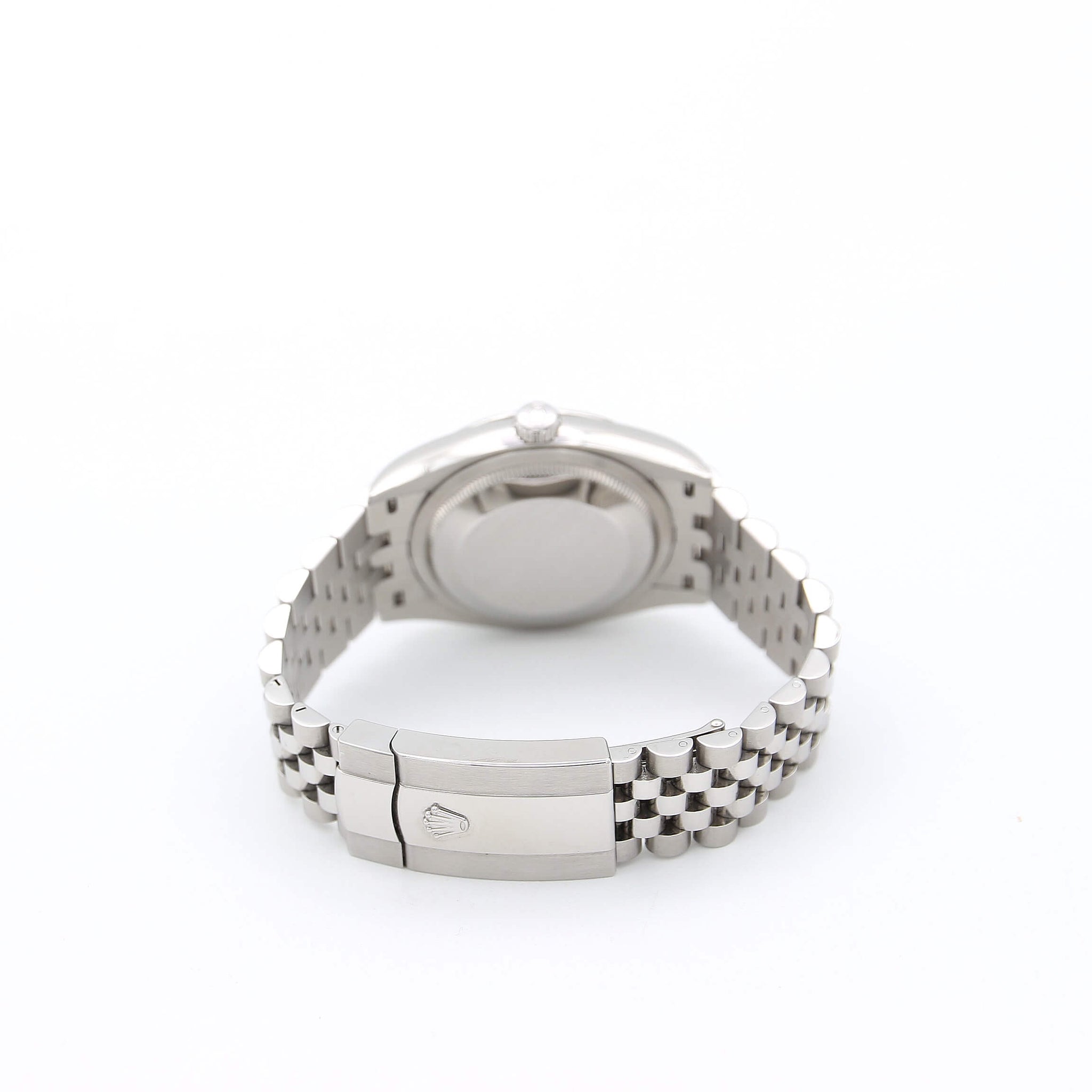 This Oyster Perpetual Datejust 36 features a chic white dial with Roman numbers and Jubilee bracelet.