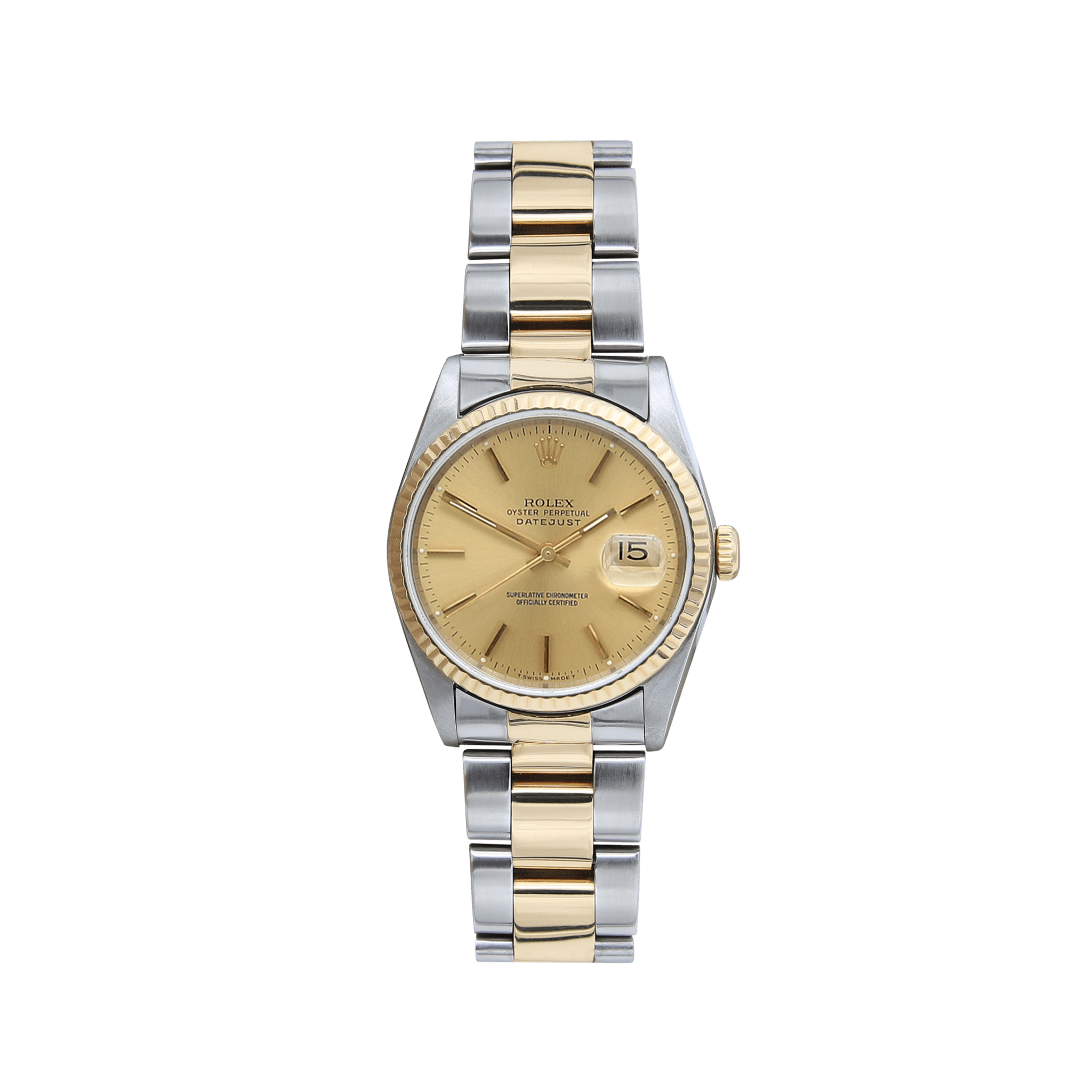 Fluted yellow gold bezel on an Oyster bracelet, with an elegant champagne dial.