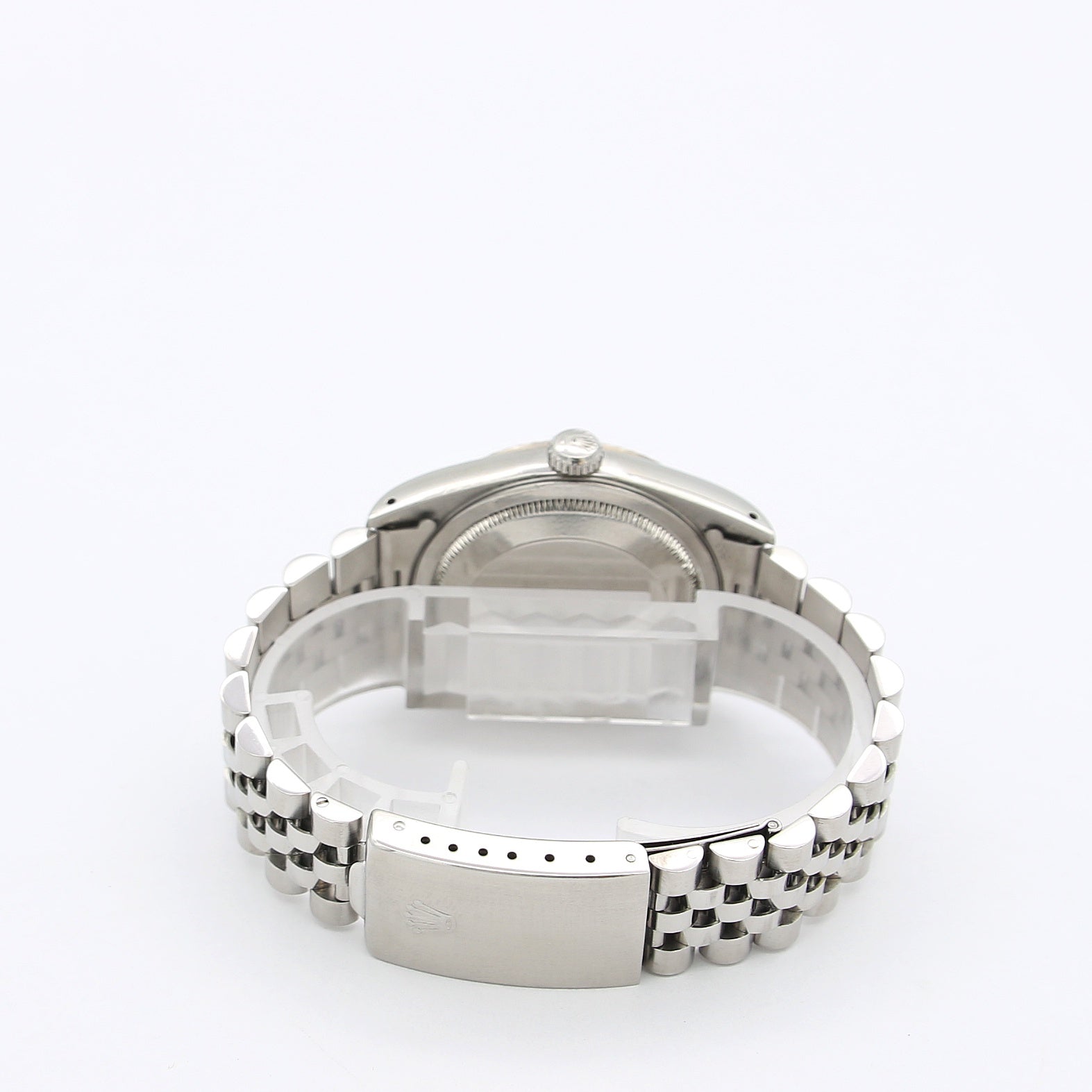 This 36 mm. diameter stainless steel case is set with screw-down case back and crown, a fluted white gold bezel, a sapphire crystal with cyclops lens.