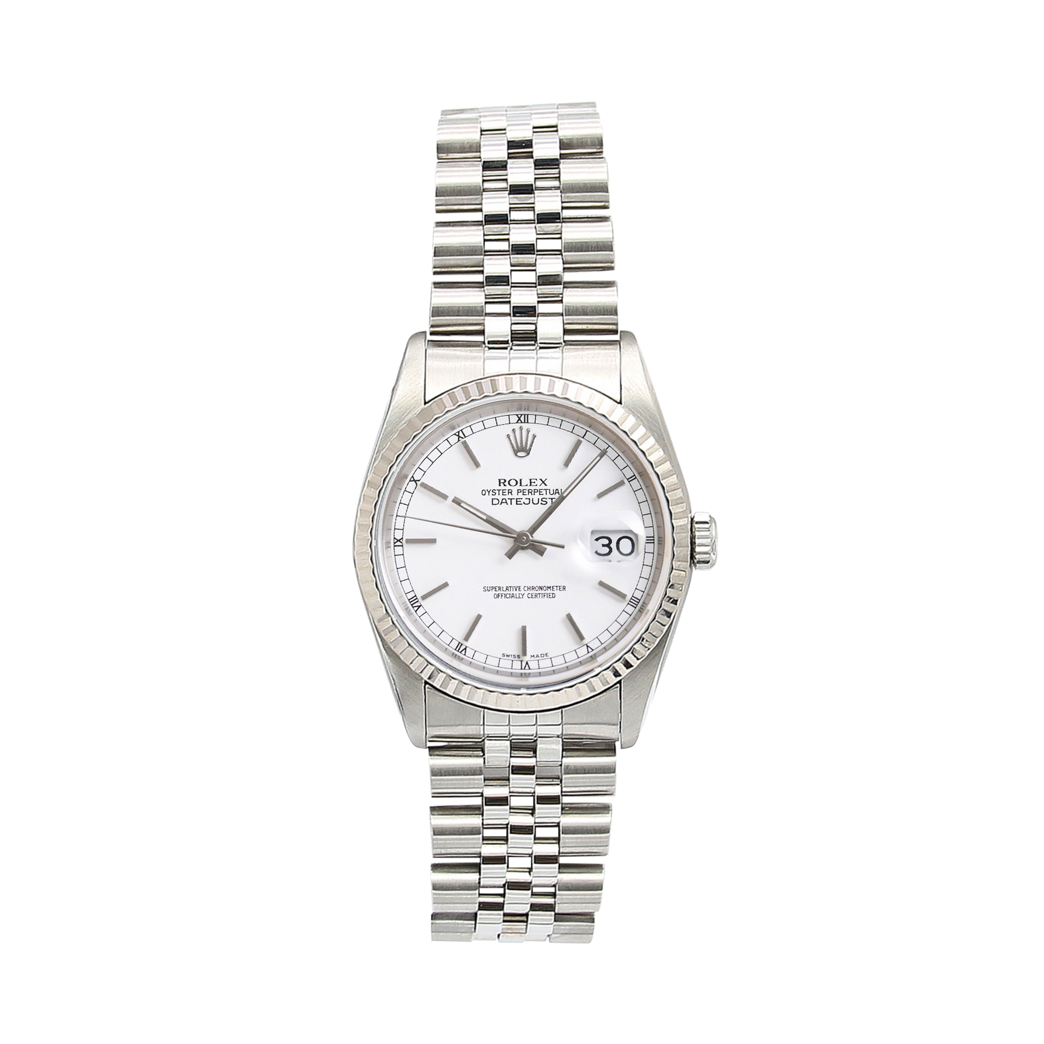 This Rolex Datejust in steel presents a bright white dial, a white gold bezel and a coordinated jubilee bracelet.