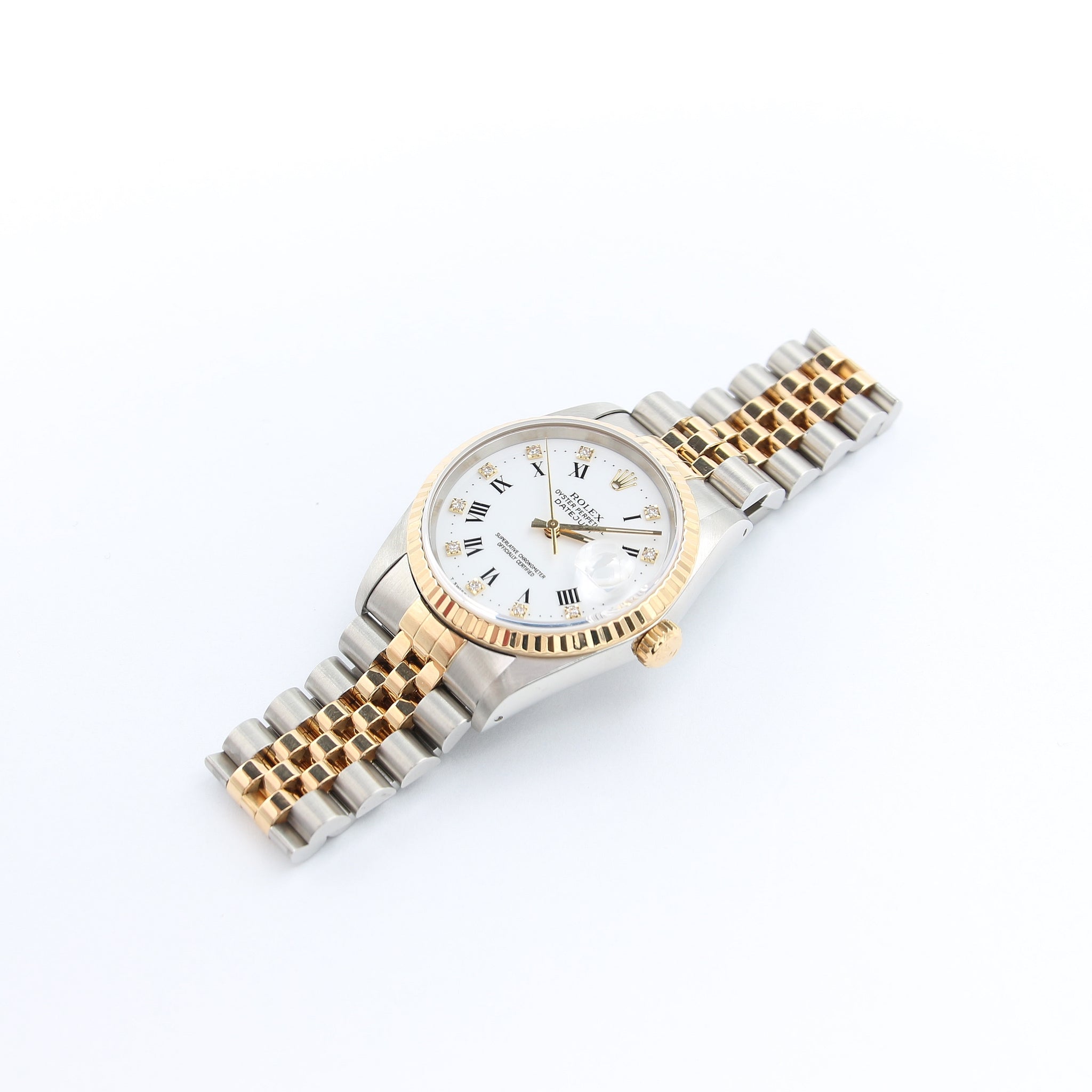 Fluted yellow gold bezel on a Jubilee bracelet, with an incredible white dial with diamonds.