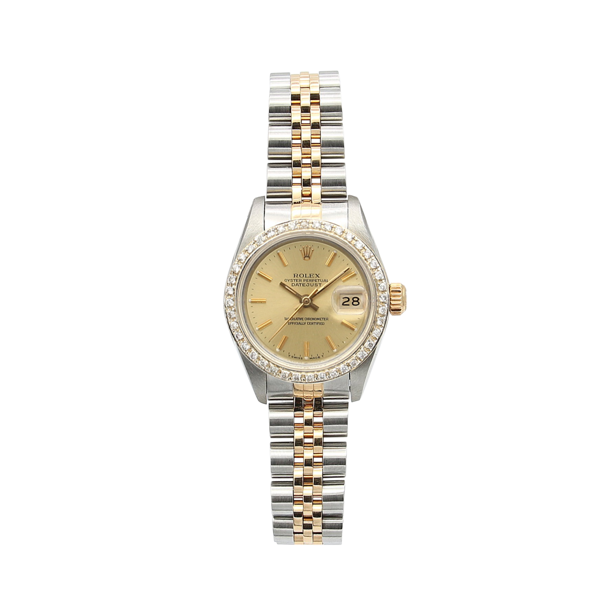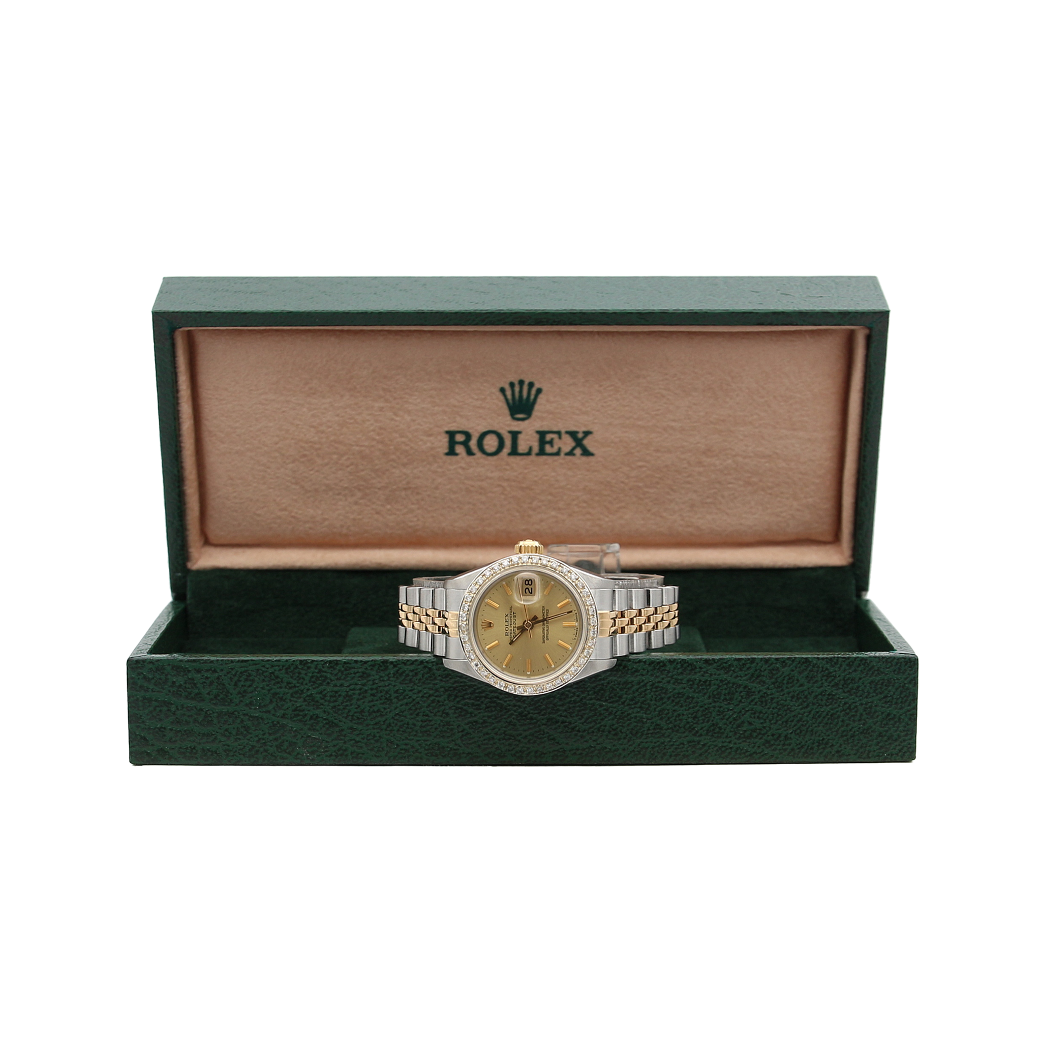 For sale at Debonar Watches: pre-owned Rolex Datejust Lady ref. 69173 from the end of the '90s, with an original Rolex champagne dial and a customized yellow gold bezel with diamonds (customized by an unknown artisan).