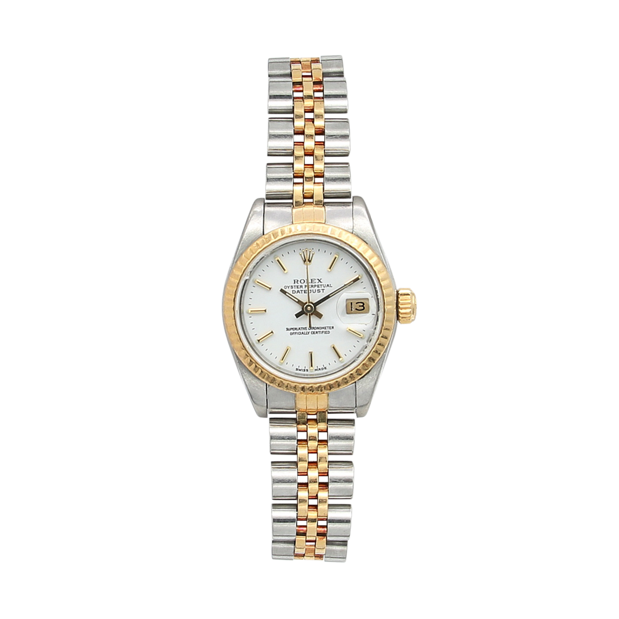 This 26mm model has a stainless steel case with an 18k yellow gold fluted bezel and a two-tone Jubilee bracelet. The dial presents a date window displayed at 3 o'clock under a cyclops lens.