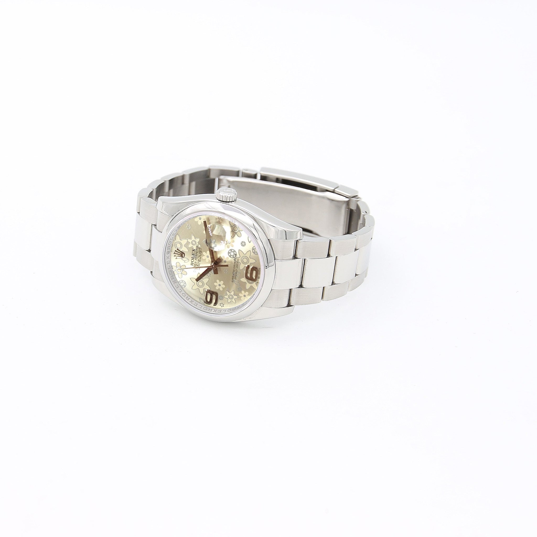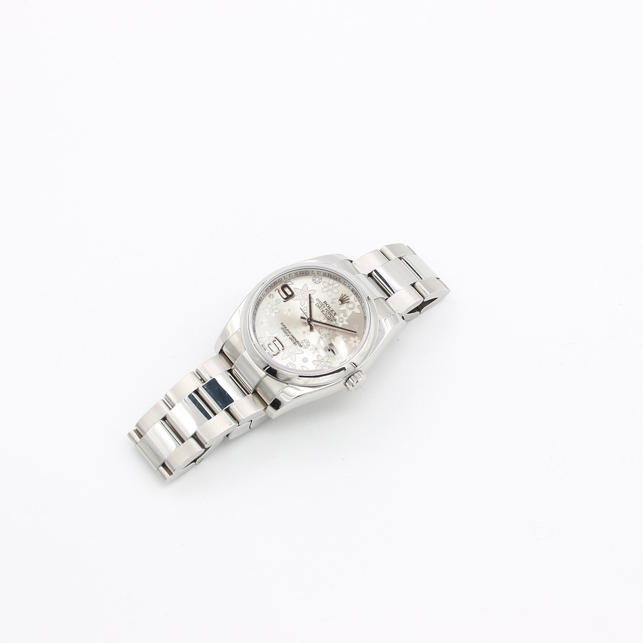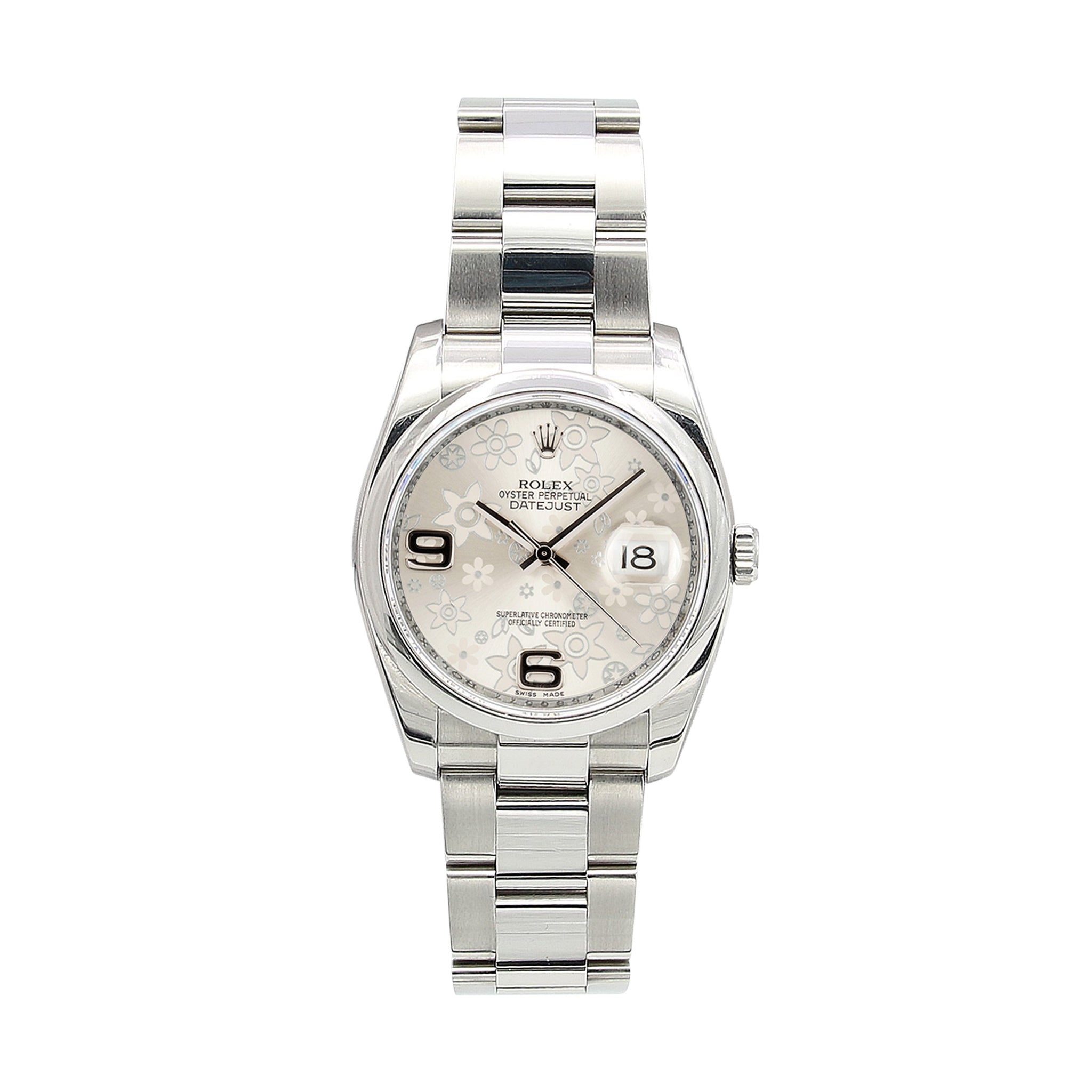 A rare and elegant silver floral-pattern dial makes this Rolex Datejust 116200 a unique collector’s piece.