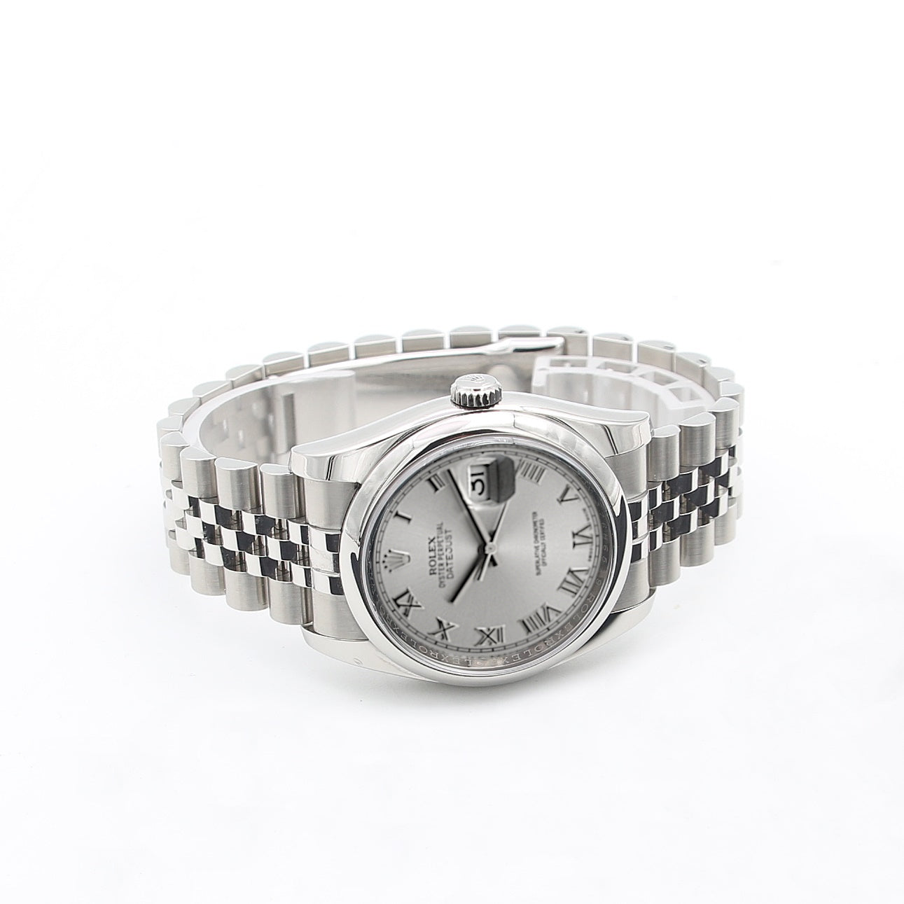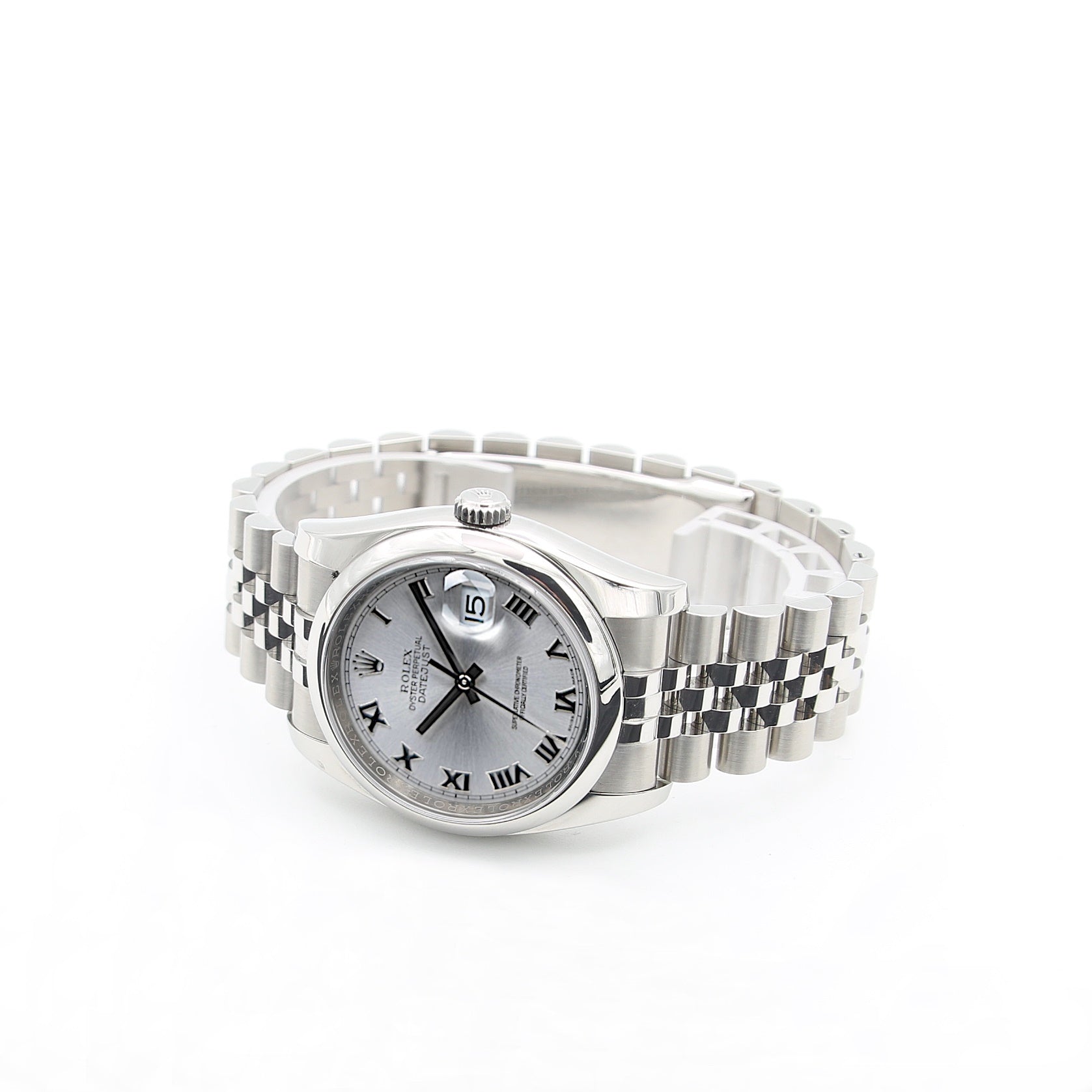 For sale at Debonar Watches: pre-owned Rolex Datejust 116200, in excellent conditions, with a modern silver dial with roman numbers, with Warranty Rolex and box.