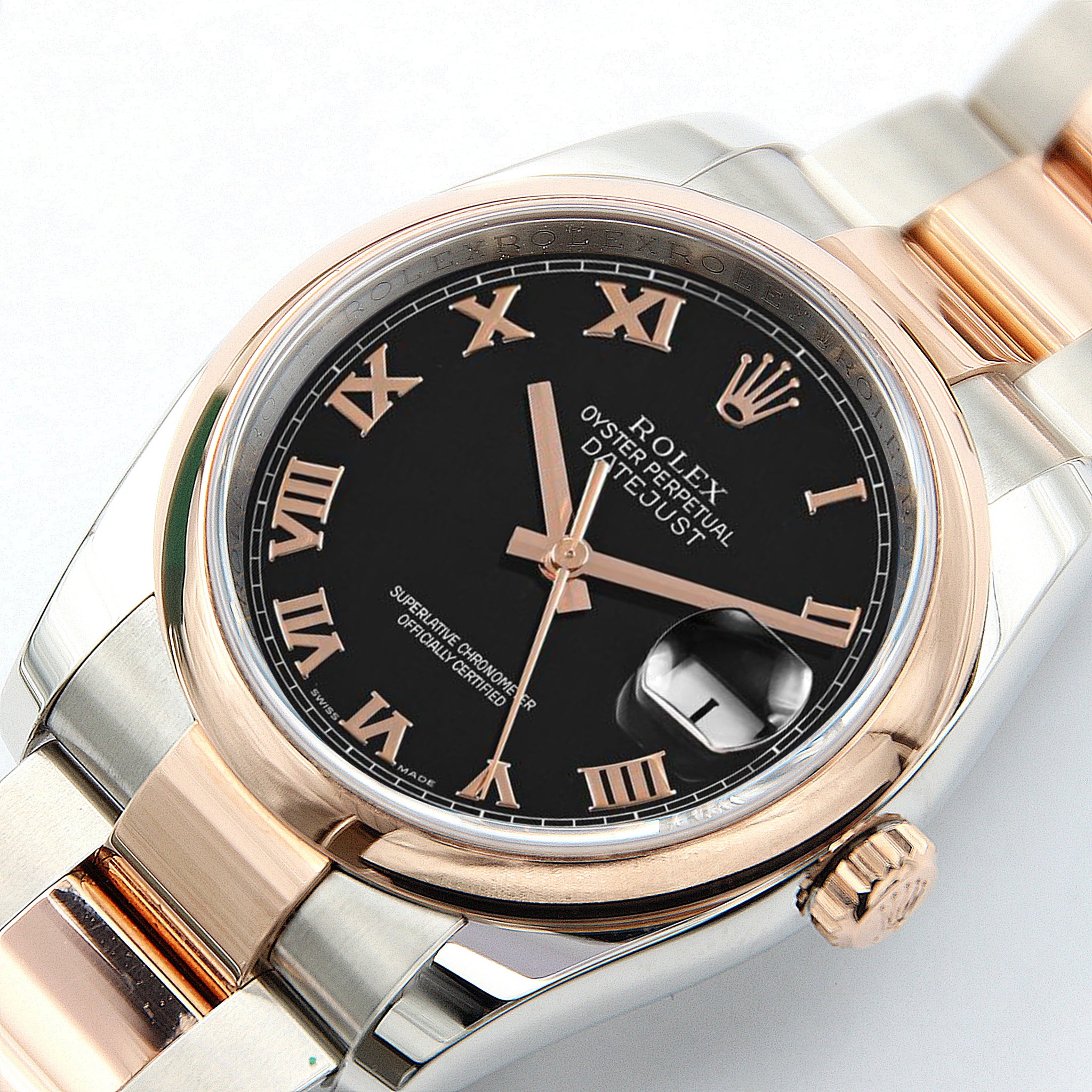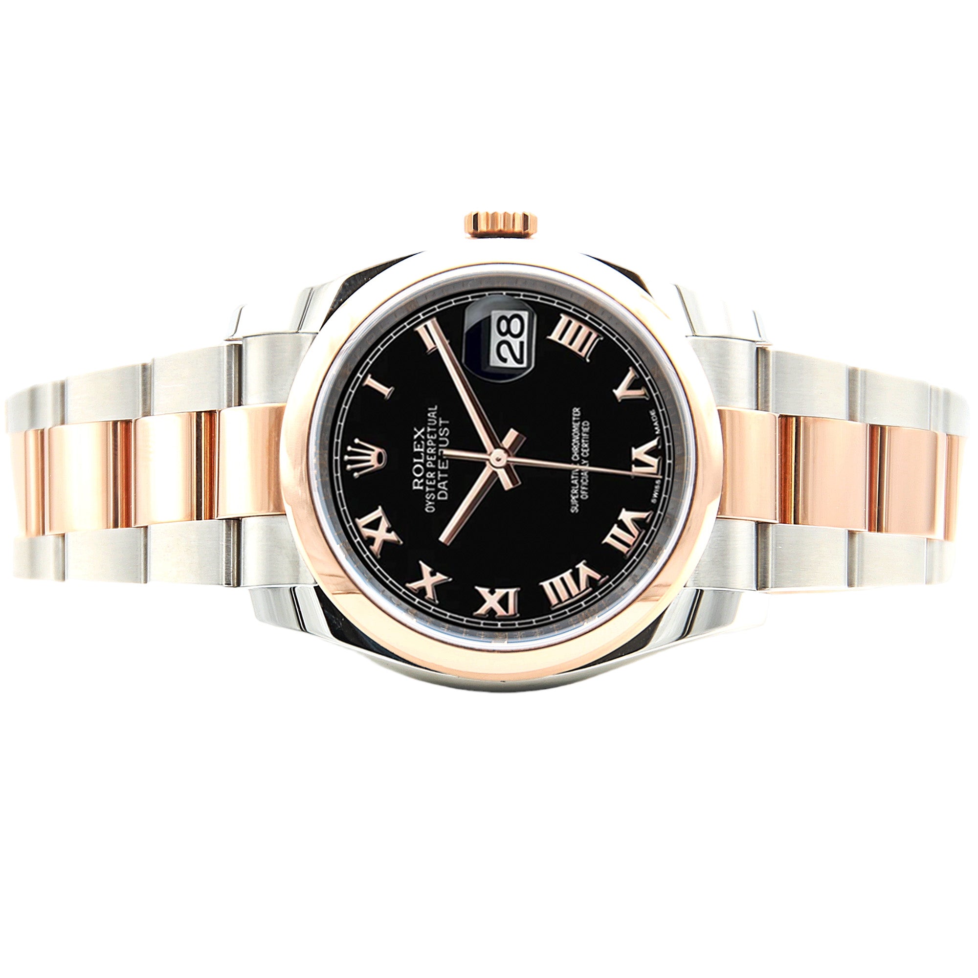 The black Roman numeral dial on this Rolex Datejust 116201 enhances its timeless charm and readability.