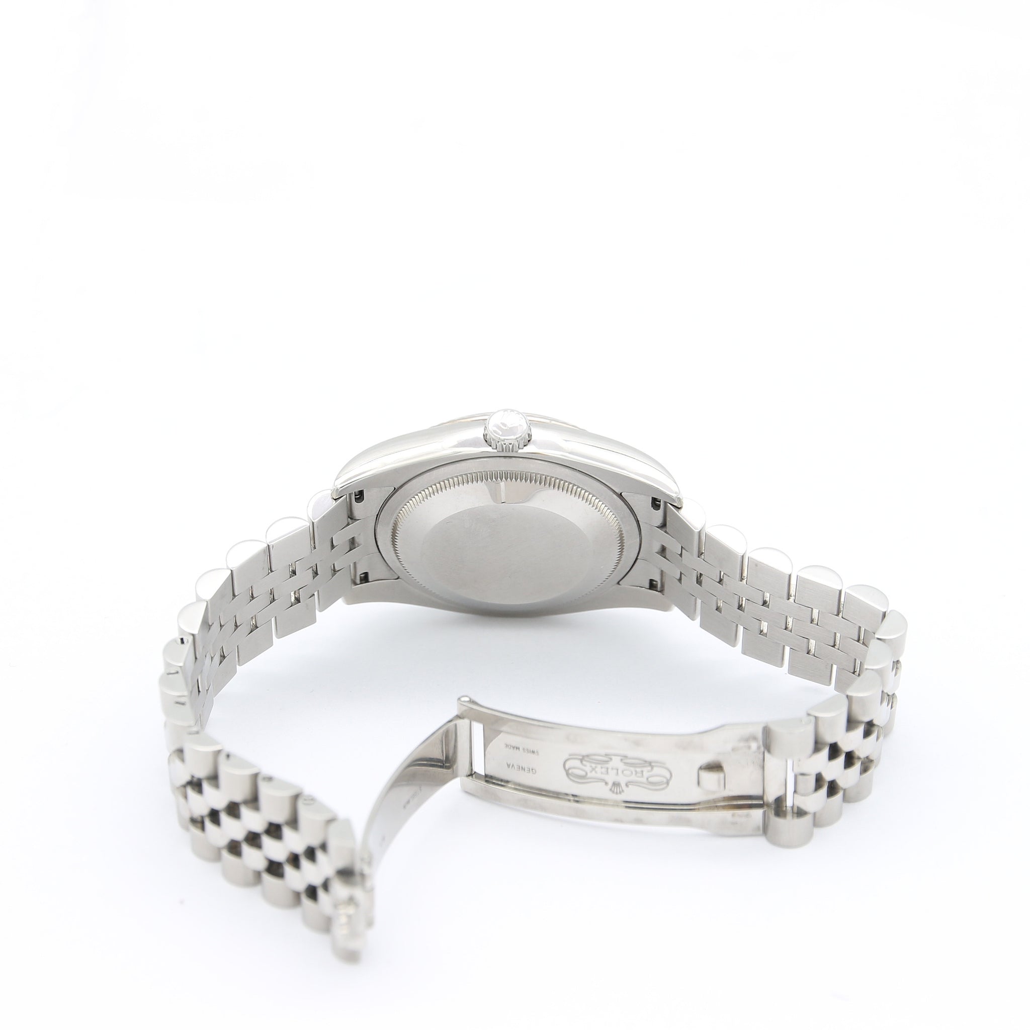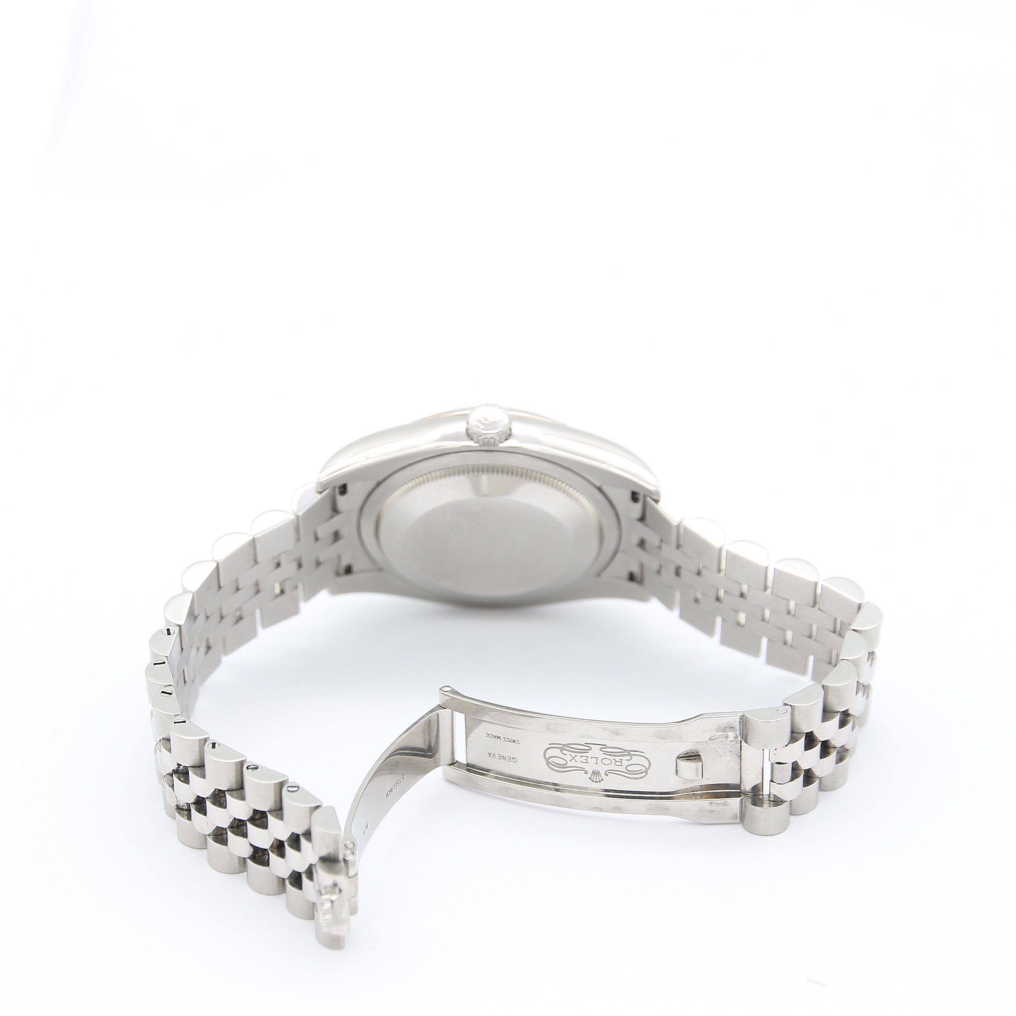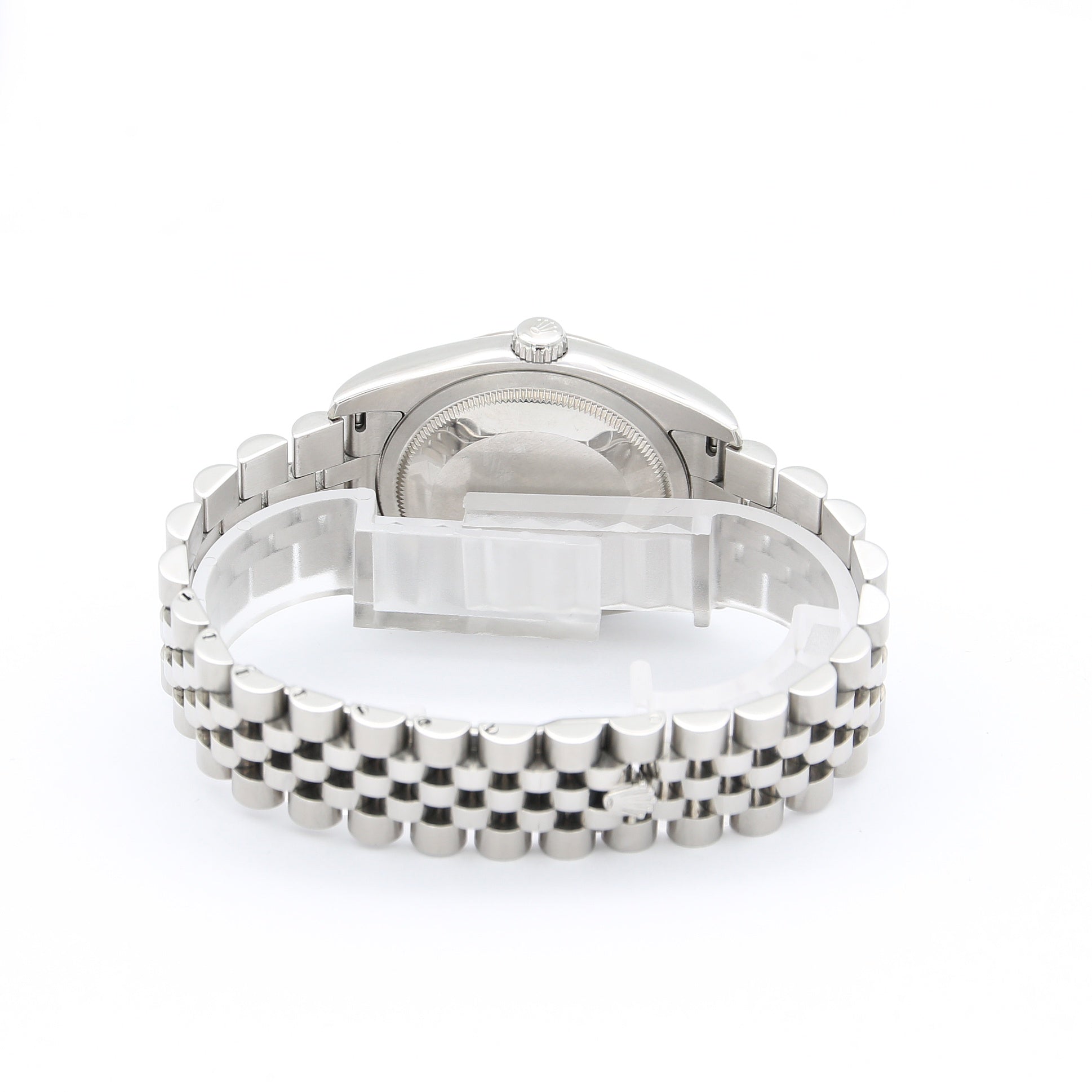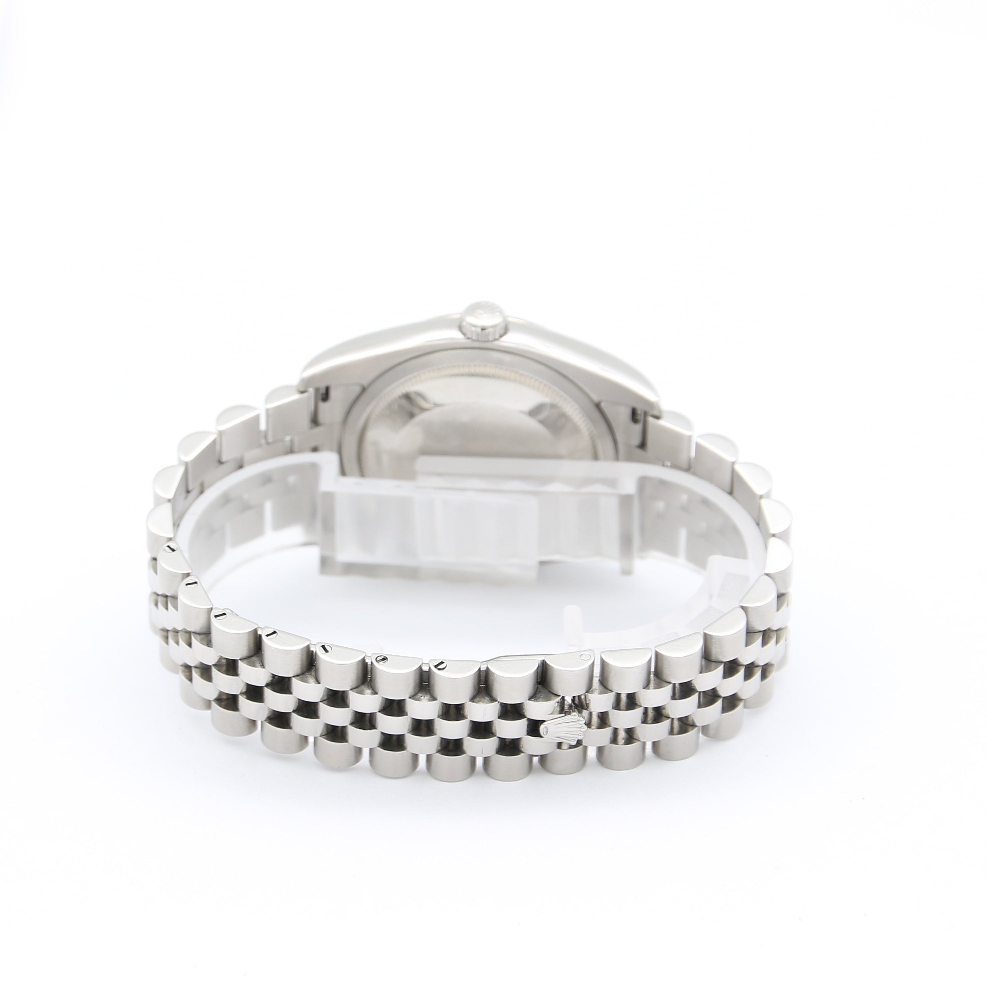 The silver floral dial of this Rolex Datejust 116234 adds a distinctive touch to an already legendary design.