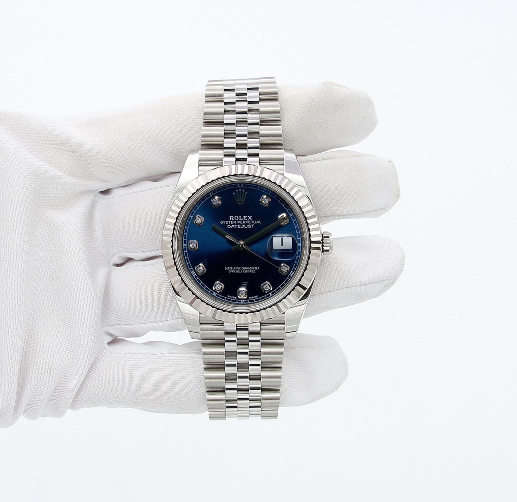 For sale at Debonar Watches: pre-owned Rolex Datejust ref. 126334 full set, with a modern blue dial with diamonds and a Jubilee bracelet.