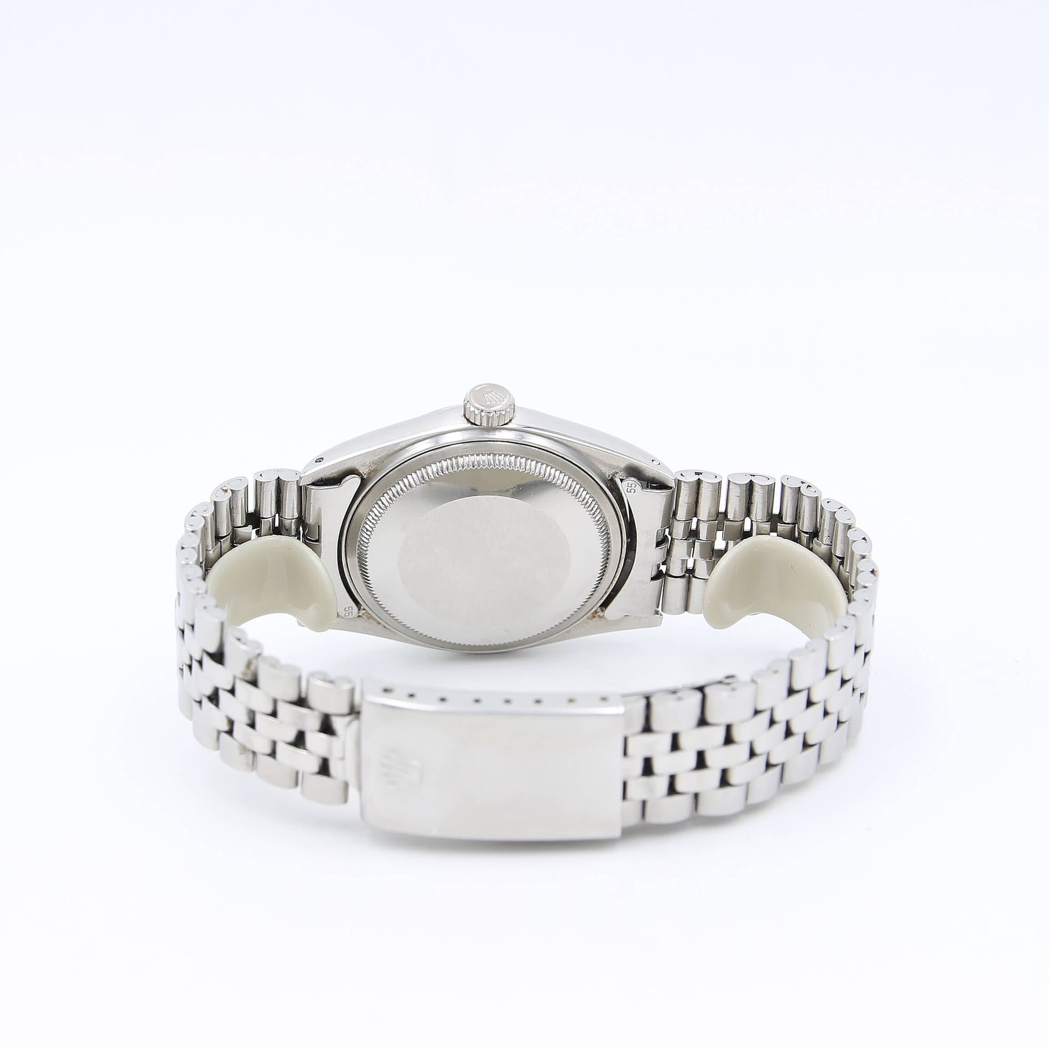 This Rolex has all the signature aesthetics of a Datejust, which include a fluted bezel, baton hour markers, and the Cyclops magnifying bubble over the date window.