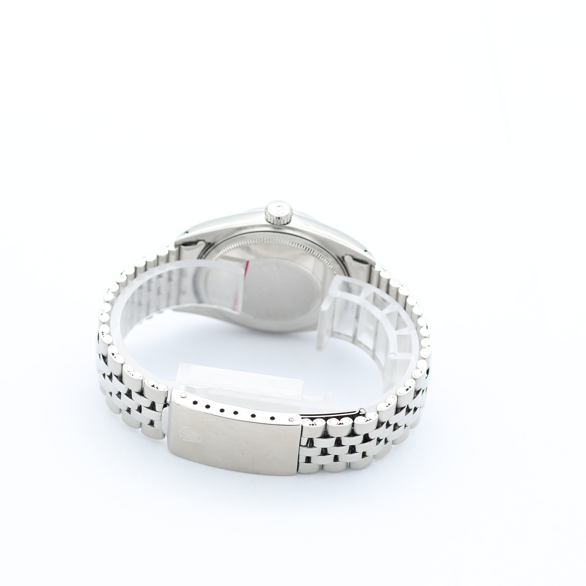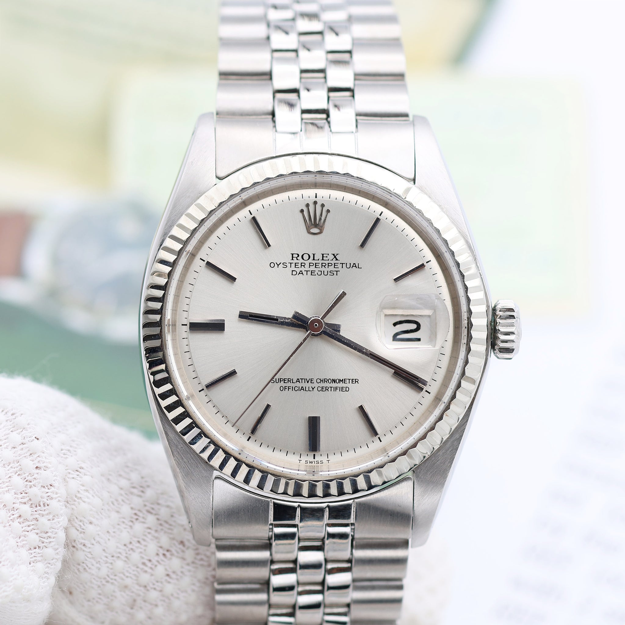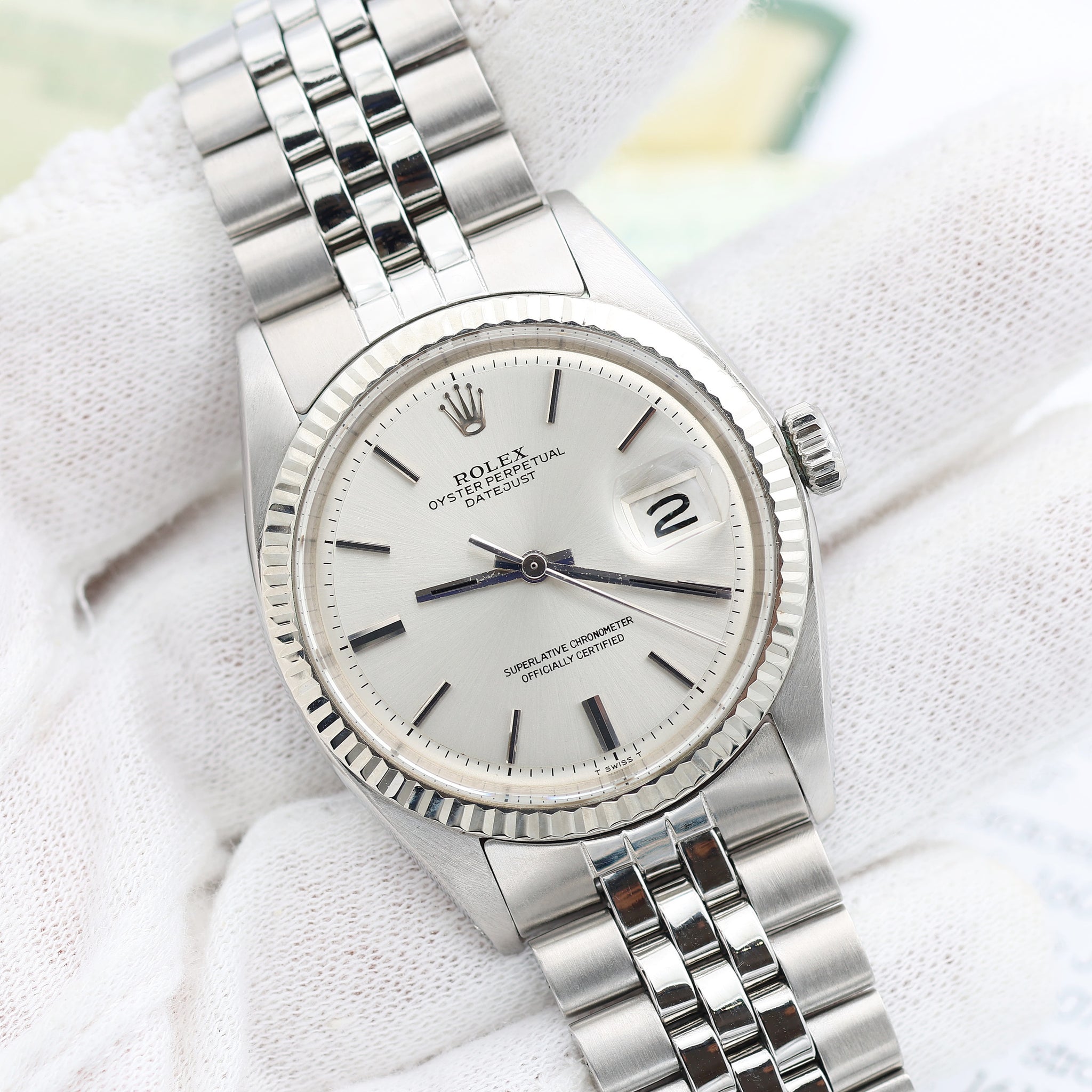 This Rolex has all the signature aesthetics of a Datejust, which include a fluted bezel, baton hour markers, and the Cyclops magnifying bubble over the date window.