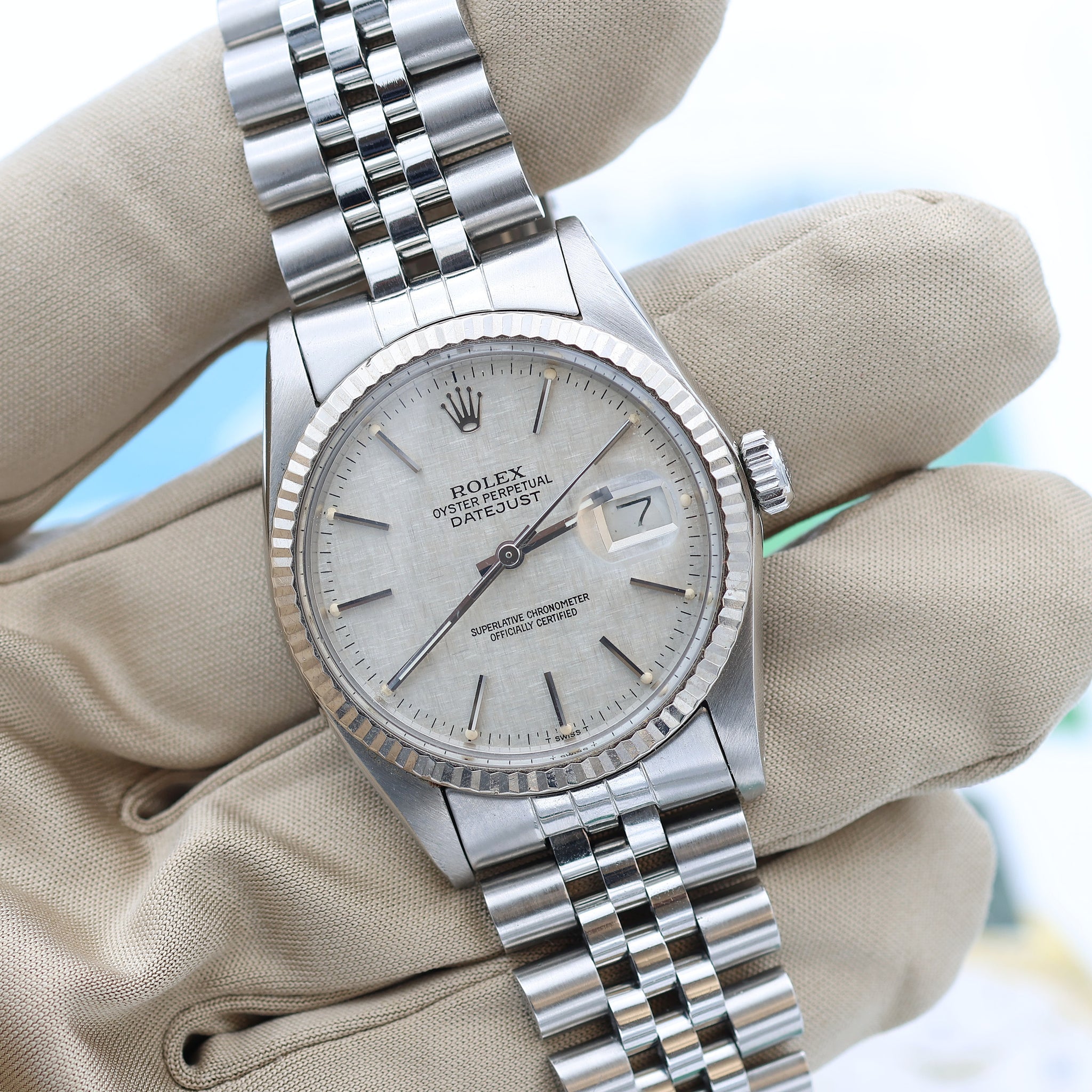 For sale at Debonar Watches: pre-owned Rolex Datejust ref. 16014 in steel with a rare silver linen dial.