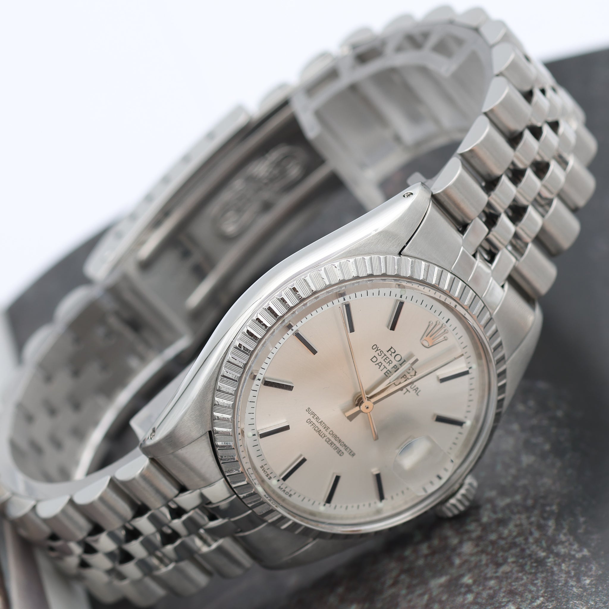 This Rolex has an engine-turned bezel, baton hour markers, and the Cyclops magnifying bubble over the date window.