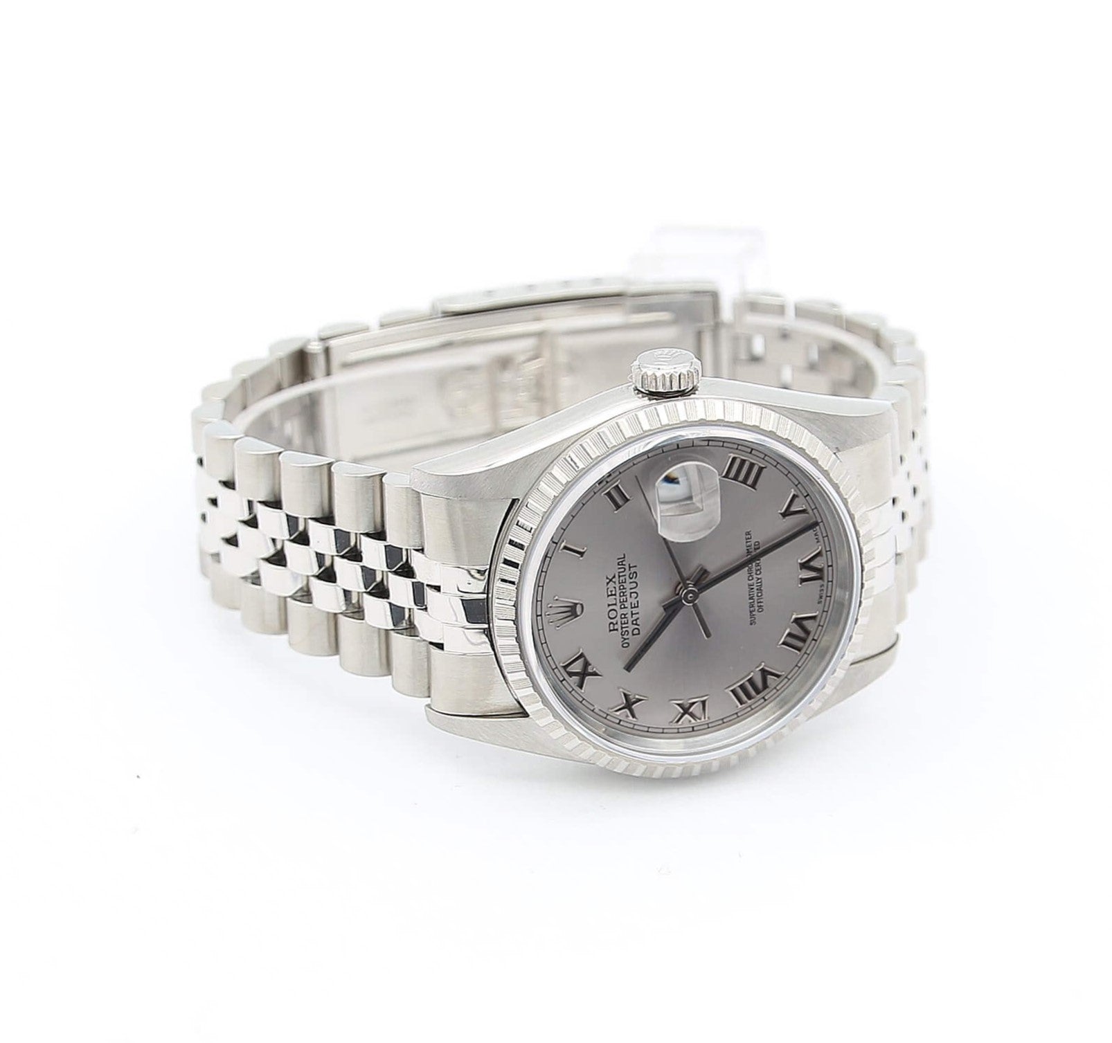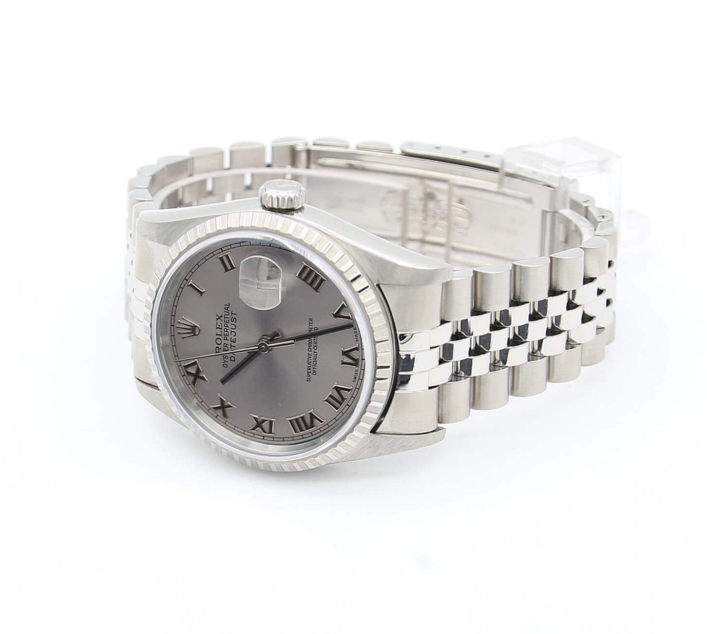 This Rolex Datejust 16220 presents a modern grey dial with roman numbers.