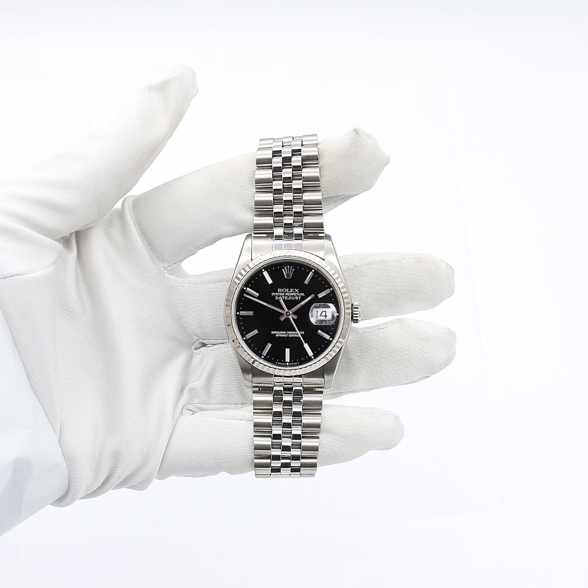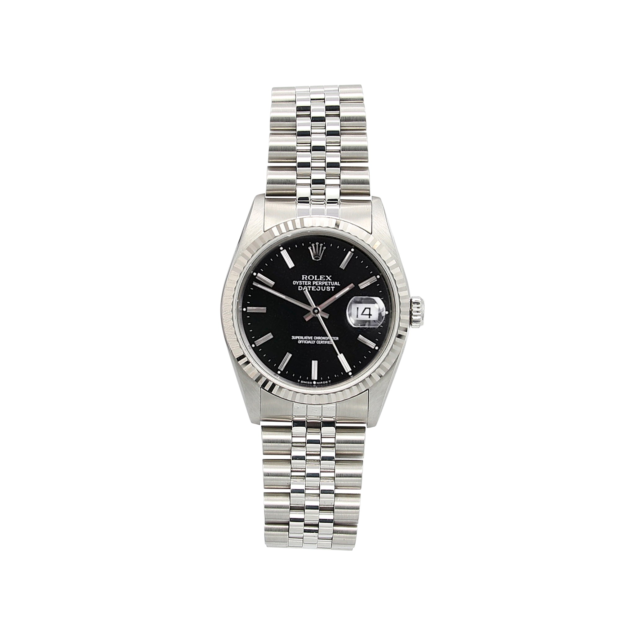 This piece is a Rolex Datejust Ref. 16234 with a black dial and date opening at 3 o'clock.