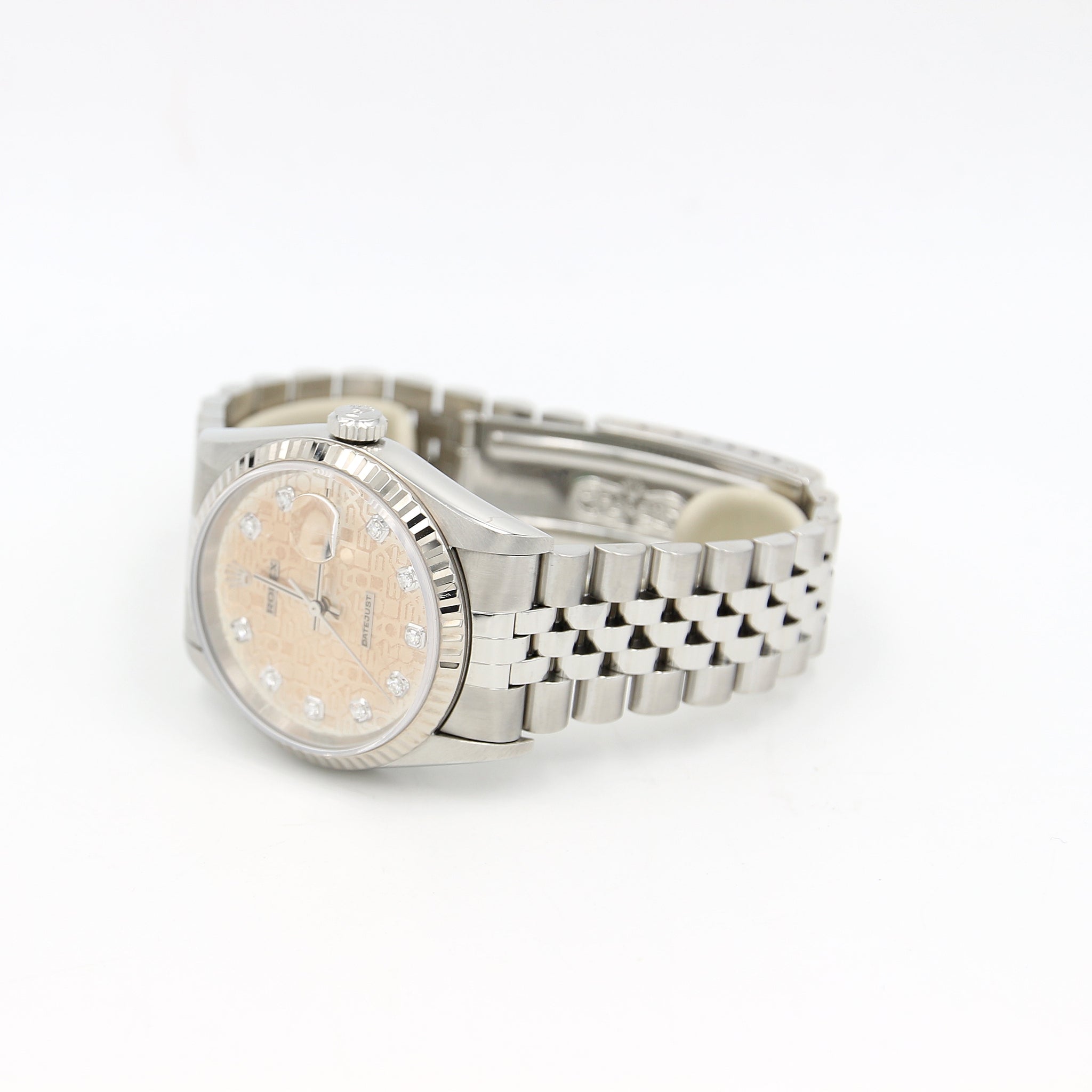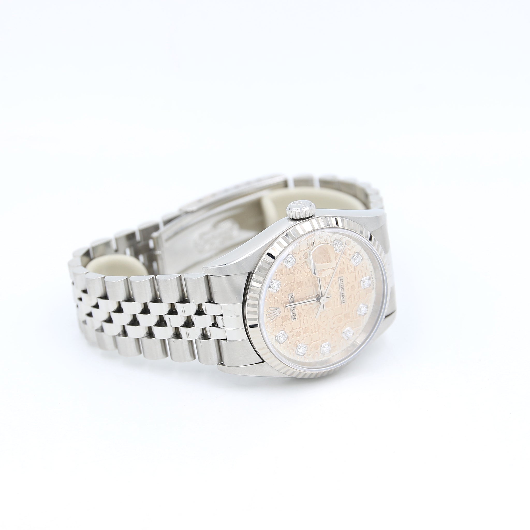 This reference 16234 is very elegant, but it still shows some personality: this Rolex watch is powered by the famously rugged and reliable 3135 calibre automatic movement and is waterproof to 100m.