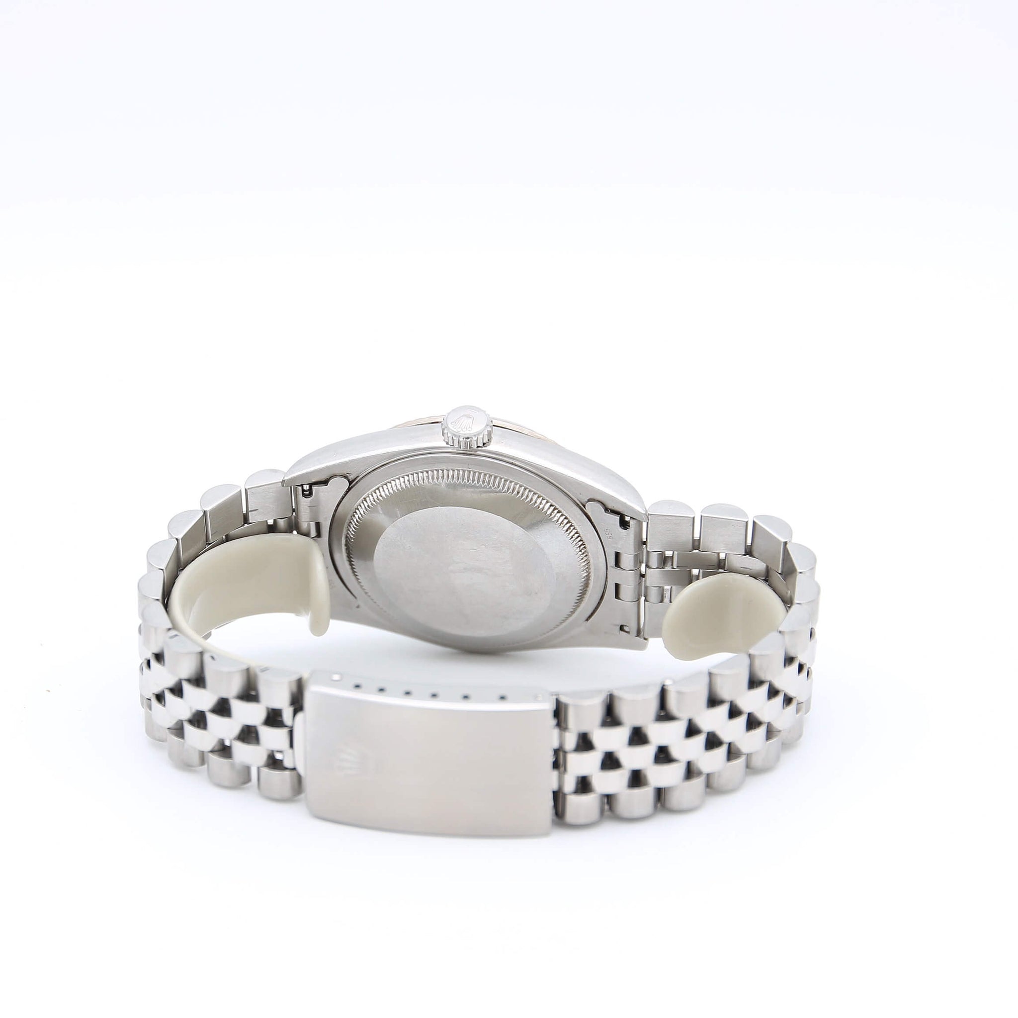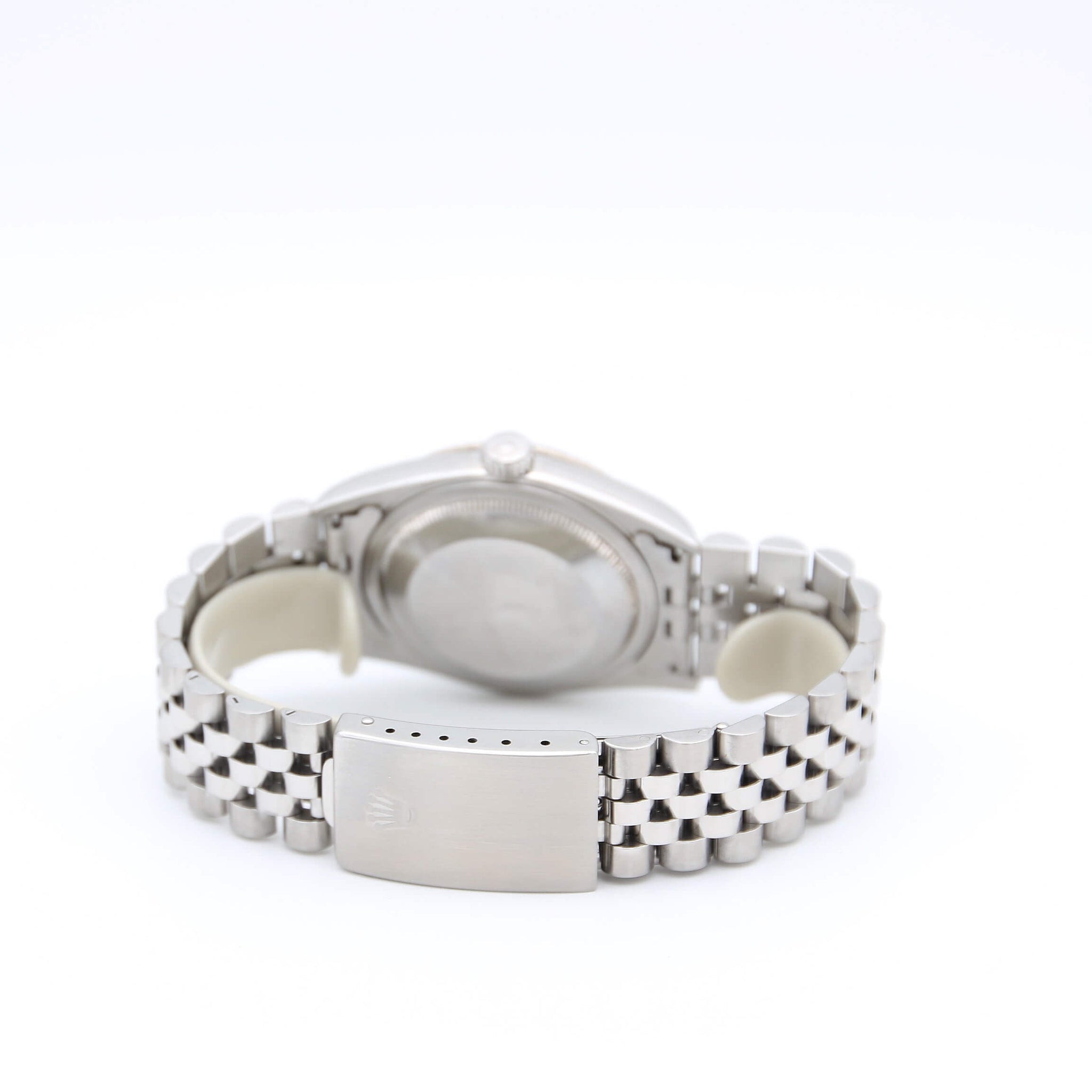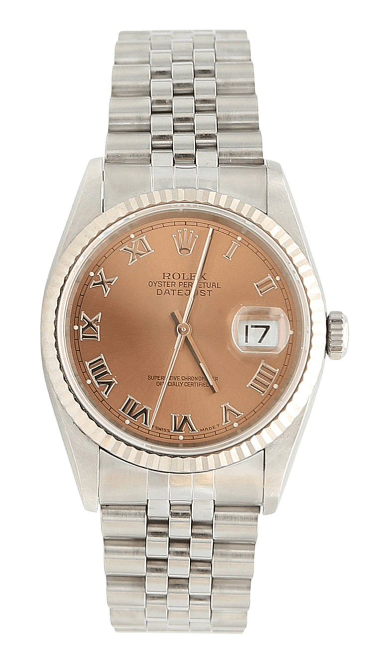 This Rolex Datejust in steel with white gold bezel presents a sophisticated salmon dial with Roman numbers and a coordinated jubilee bracelet.