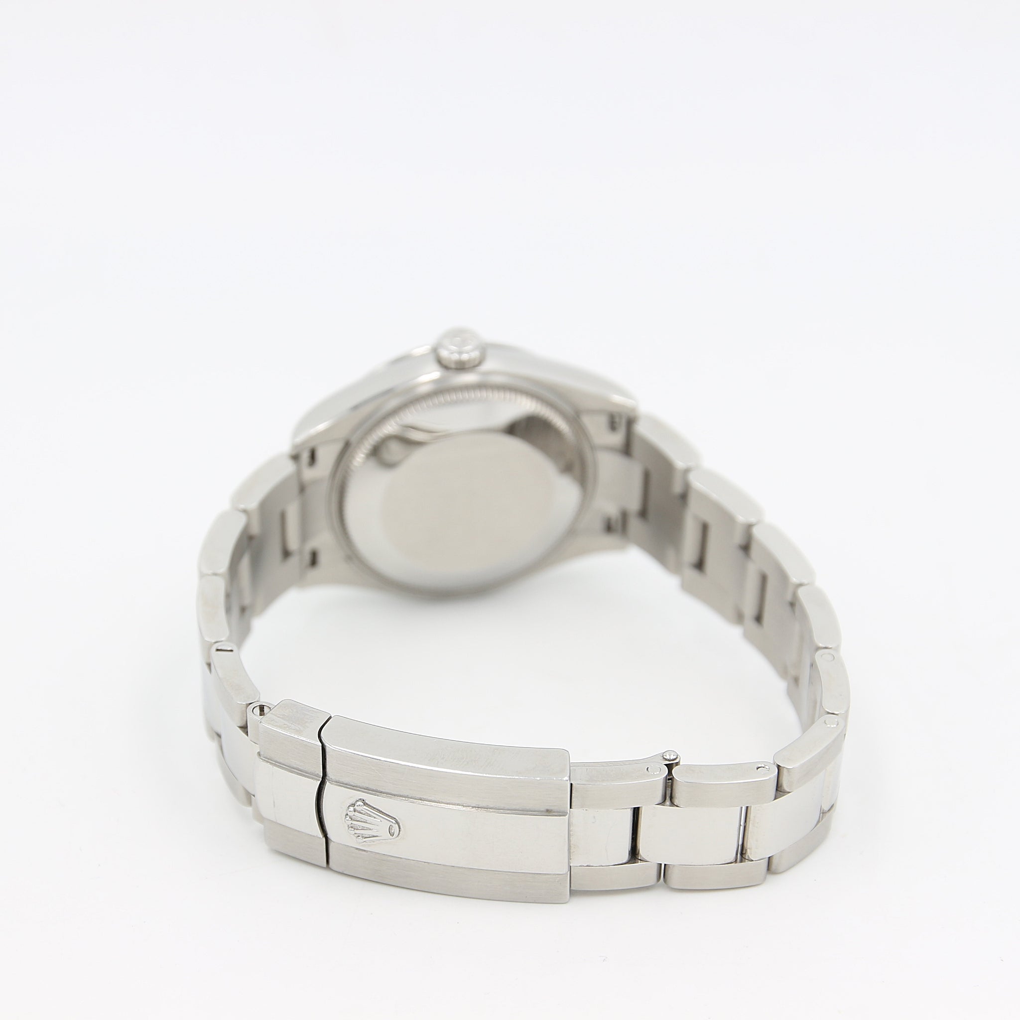 The light reflections on the case sides and lugs highlight the elegant profile of the 31 mm Oyster case, which is fitted with a domed bezel.