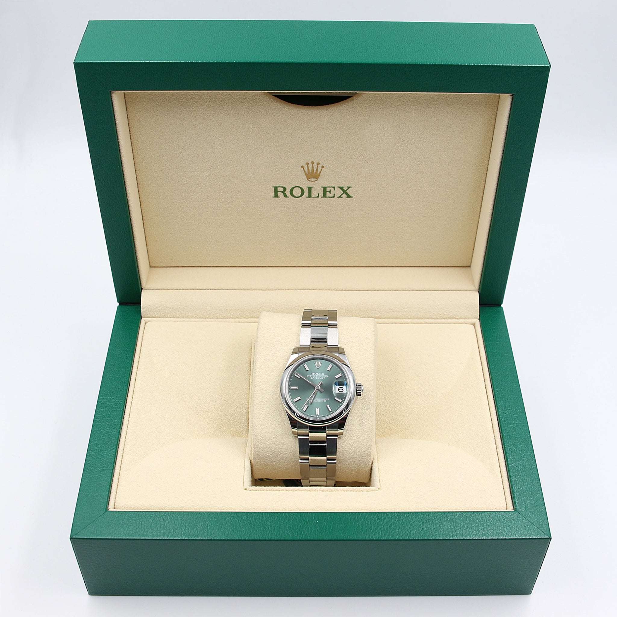 Mint green dial with raised luminous baton hour markers. Date calendar window at 3 o'clock. Oyster bracelet with oysterlock clasp.