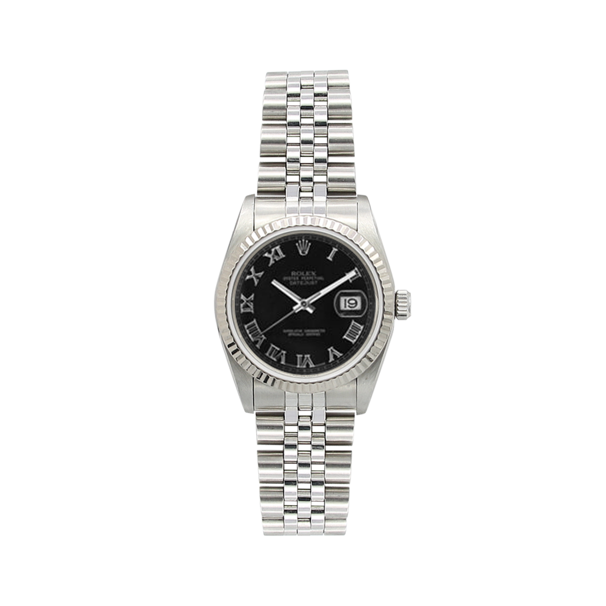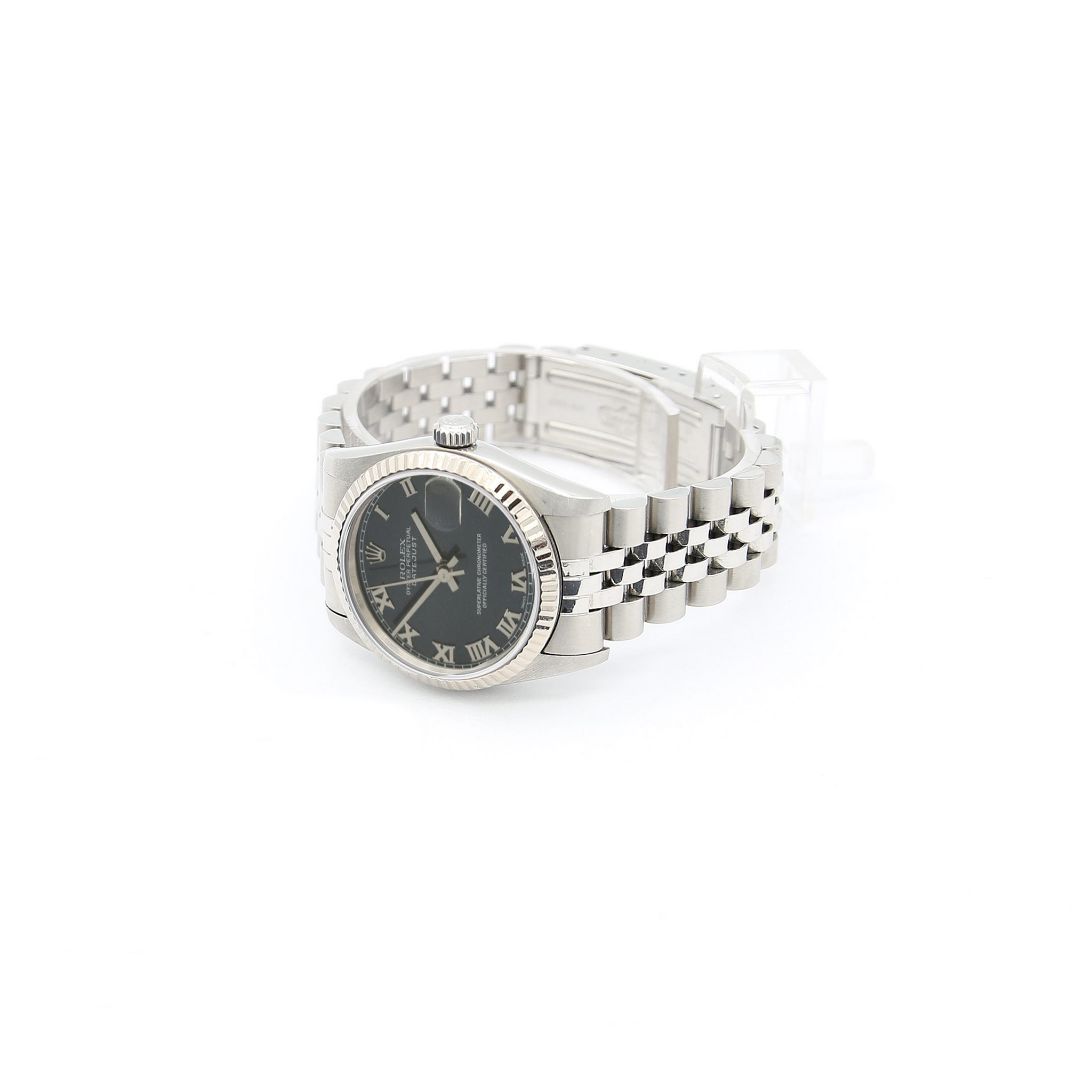 For sale a pre-owned Rolex Oyster Perpetual Datejust reference 68274 watch in steel and white gold, full set. The time is displayed on a remarkable black dial with roman numbers.