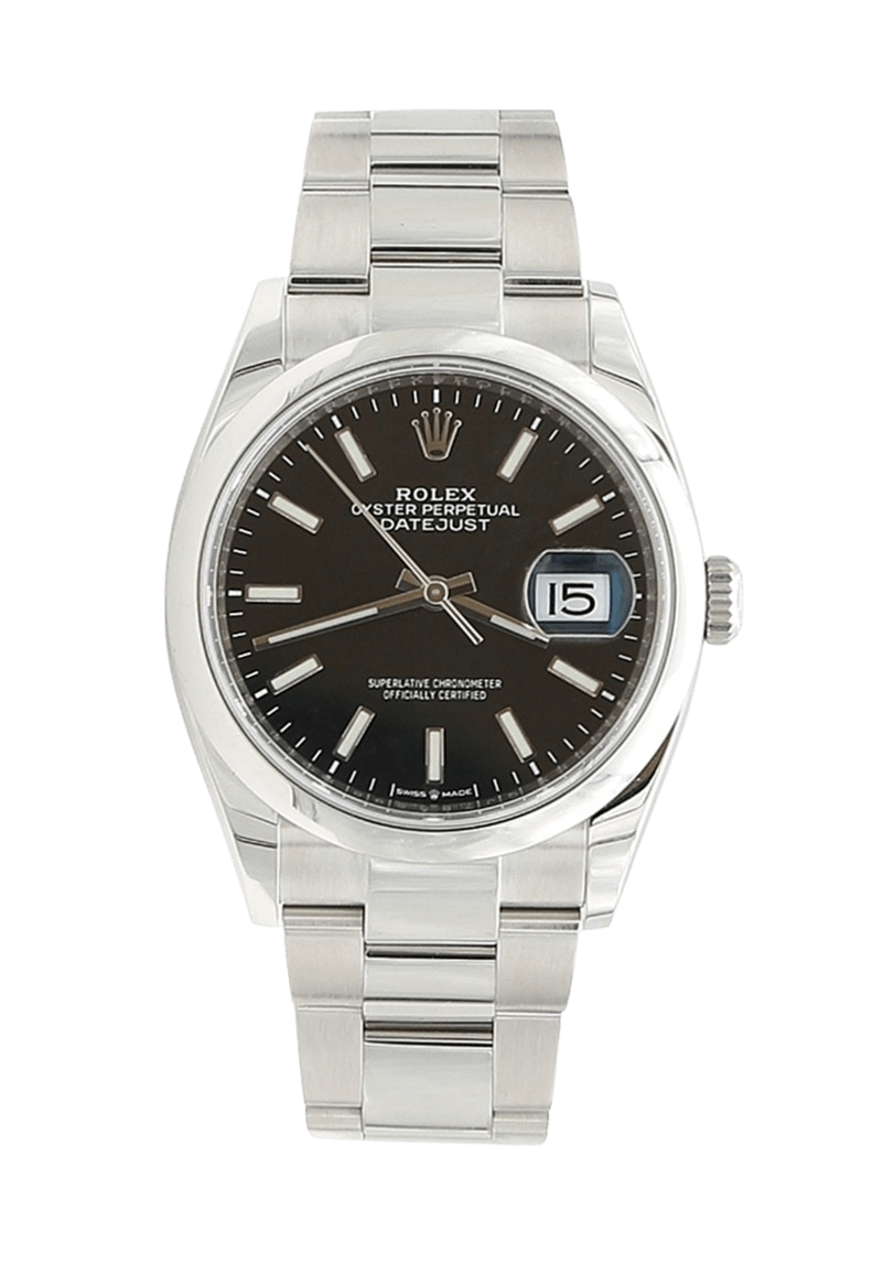 This Oyster Perpetual Datejust 36 in Oystersteel features a black dial and a solid Oyster bracelet.