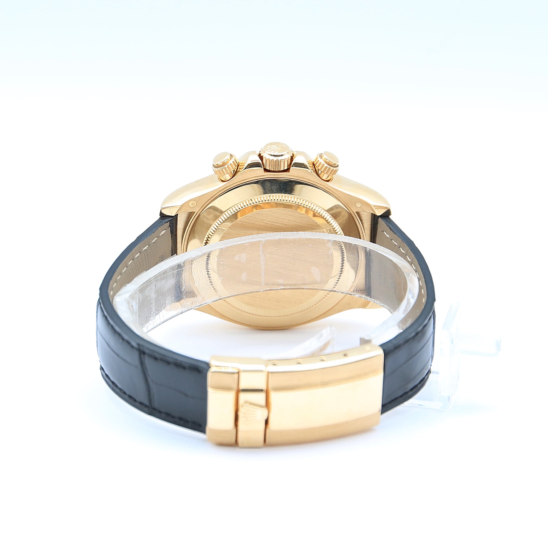 The 116518 is engineered with a 40mm yellow gold case, leather strap, yellow gold bezel, and sapphire crystal.
