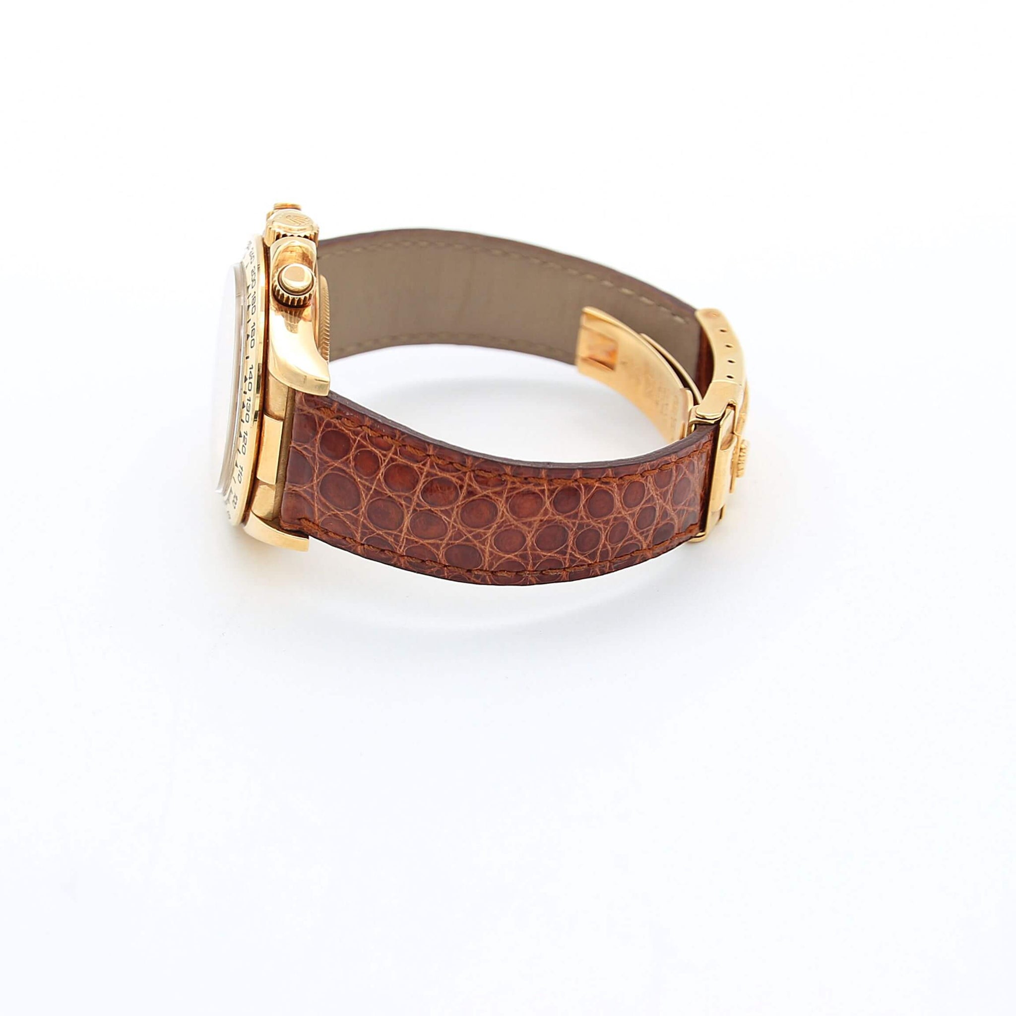 More than any other contemporary Rolex, it's a timeless piece. With its iconic case, it's a slim watch, with a leather strap and a yellow gold clasp.