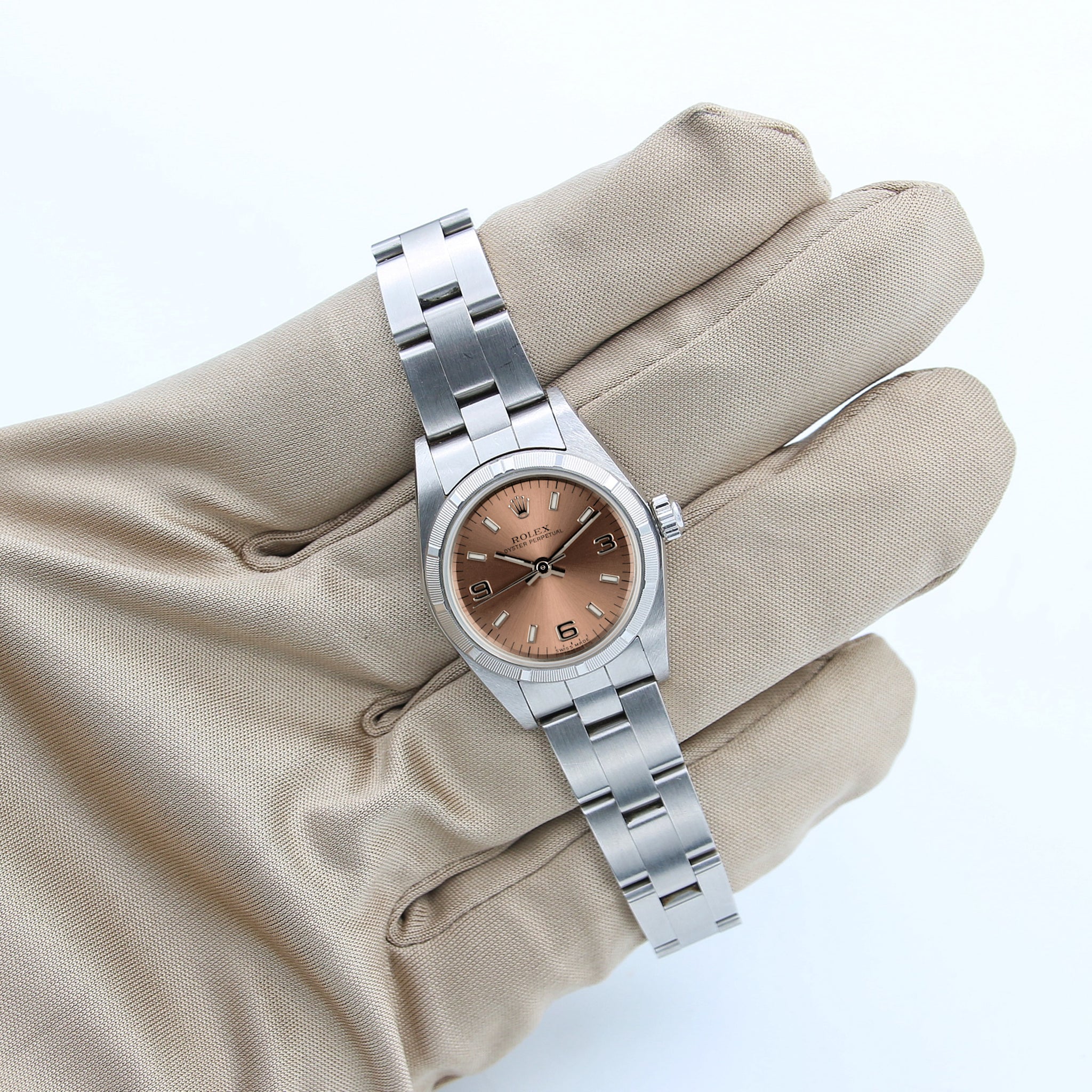 This pre-owned women's Rolex Oyster Perpetual 76030 wristwatch features a beautiful salmon dial with 3-6-9 in arabic numerals, stainless steel Oyster bracelet, sapphire crystal. 26mm in dimension.