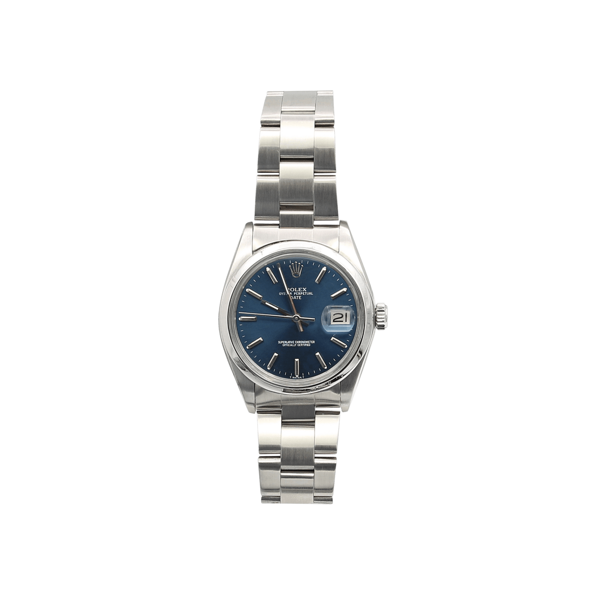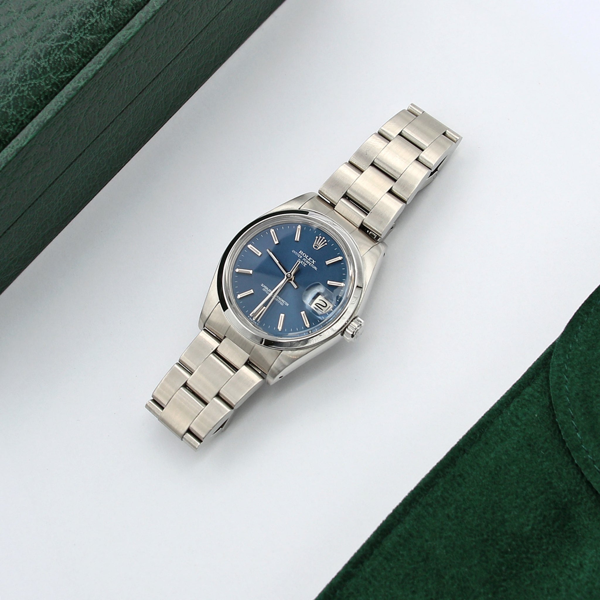 For sale at Debonar Watches: pre-owned Rolex Date 1500 from the '80s, with a deep blue dial.