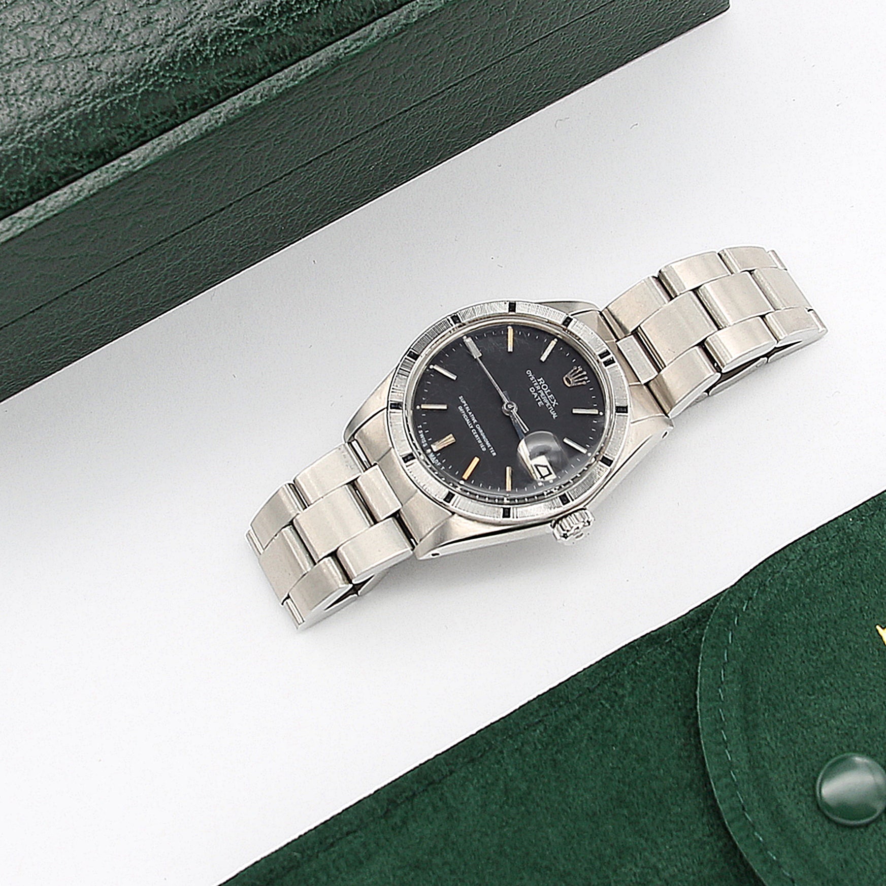 For sale at Debonar Watches: pre-owned Rolex Date 1501, an amazing vintage Rolex, with black dial and Oyster bracelet.