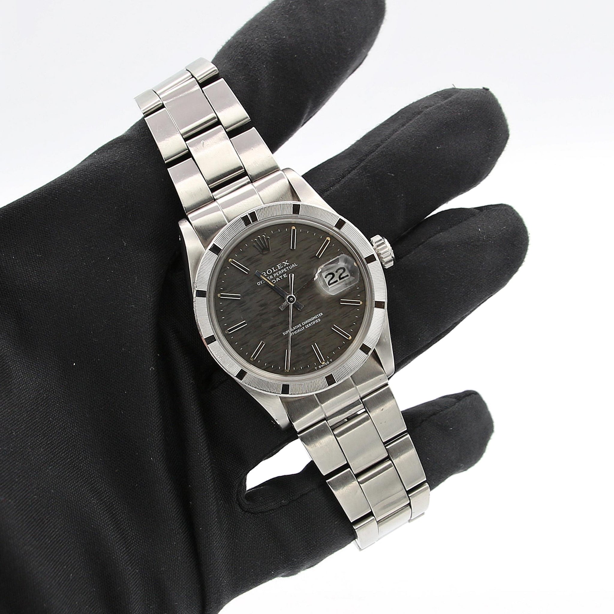 For sale at Debonar Watches: pre-owned Rolex Date 1501 with a sophisticated grey mosaic dial on top of a solid Oyster folded bracelet.