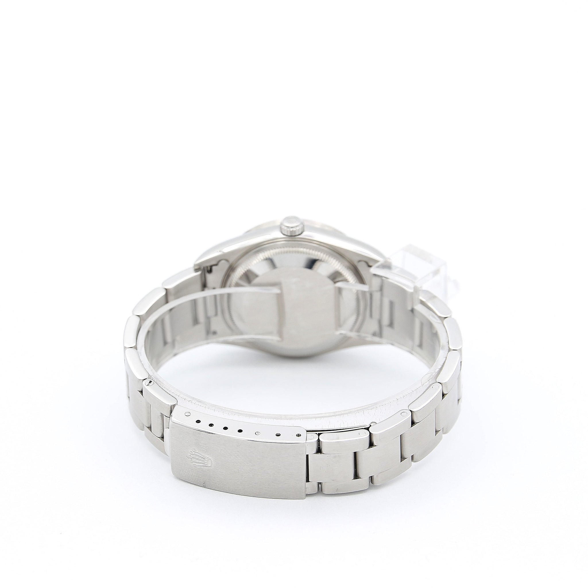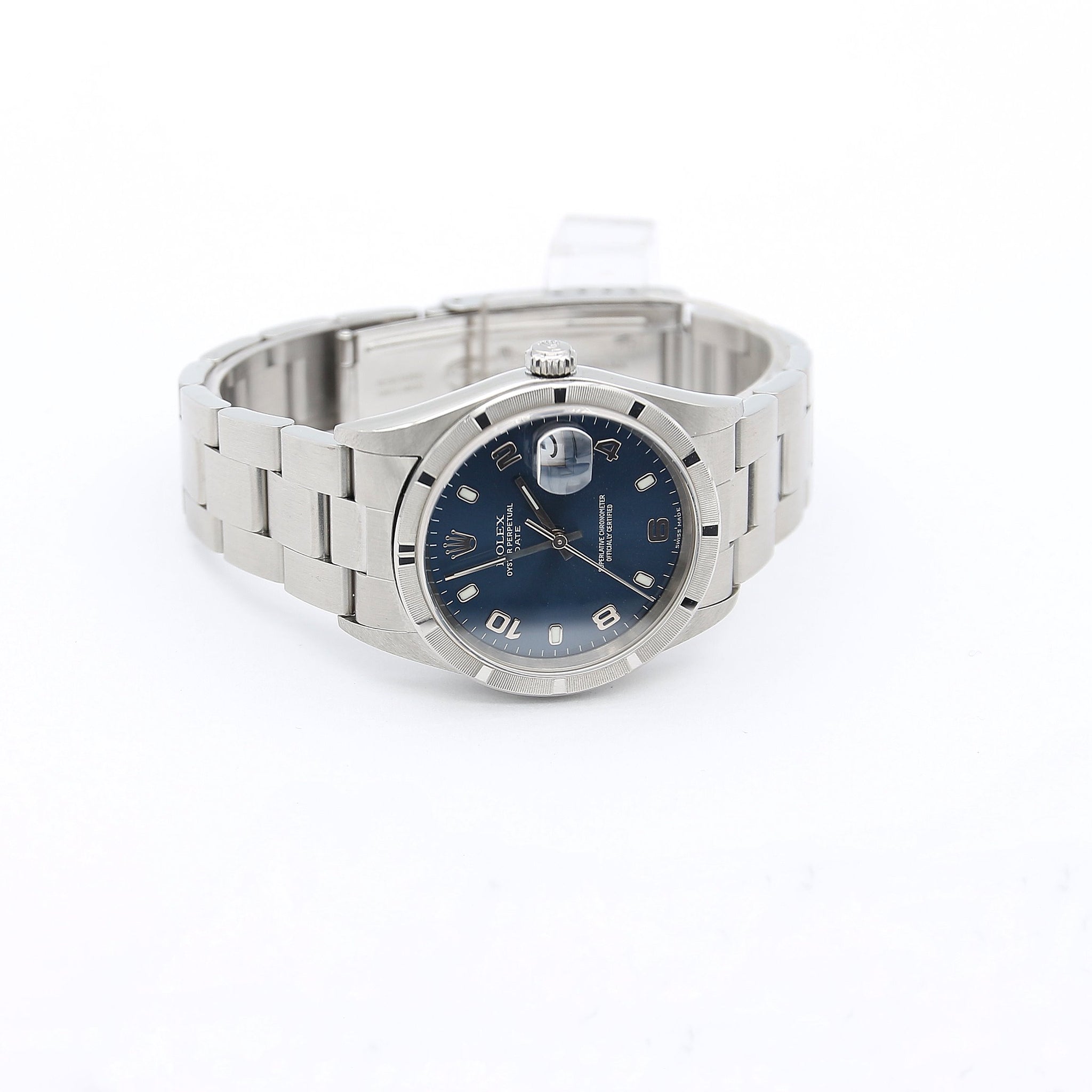 For sale: pre-owned Rolex Date ref. 15210 with a mesmerizing blue Arabic dial on an oyster bracelet.