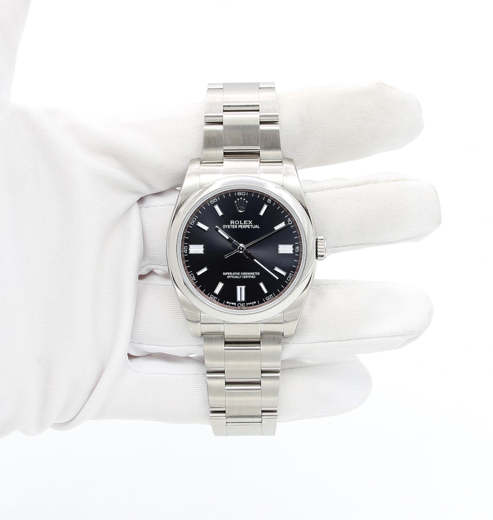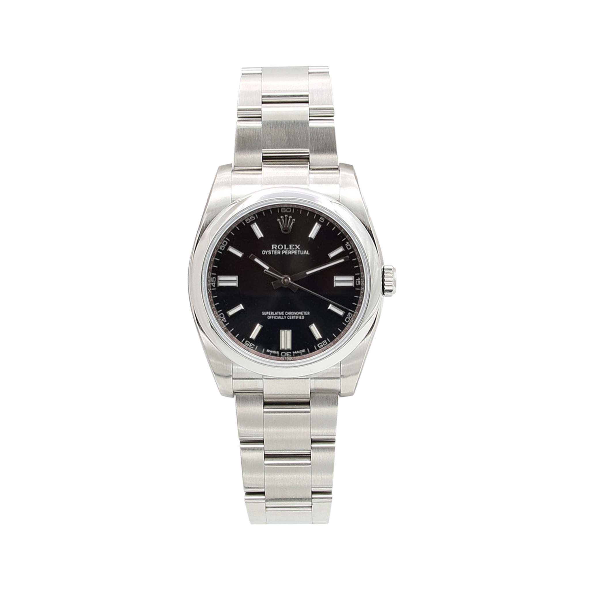 The Rolex Oyster Perpetual 36 116000 is encased in 36mm of stainless steel surrounding a deep black dial on a stainless steel Oyster bracelet.