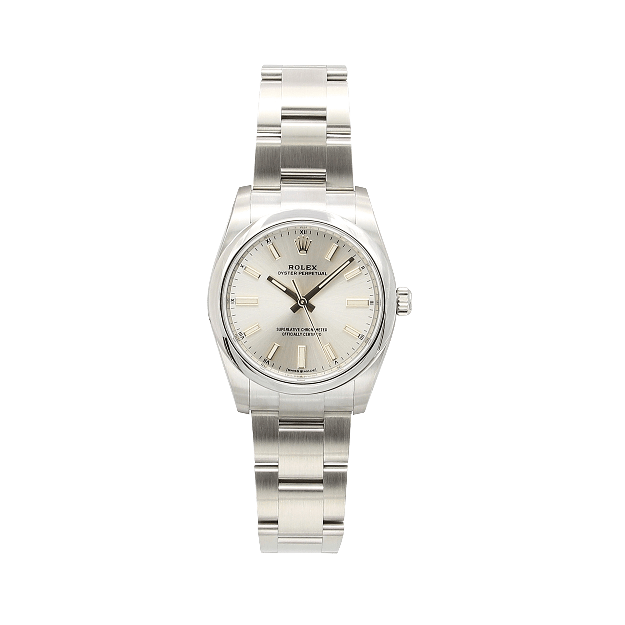 The Oyster Perpetual 34 offers a screw-down crown, a domed bezel, and a sapphire crystal.