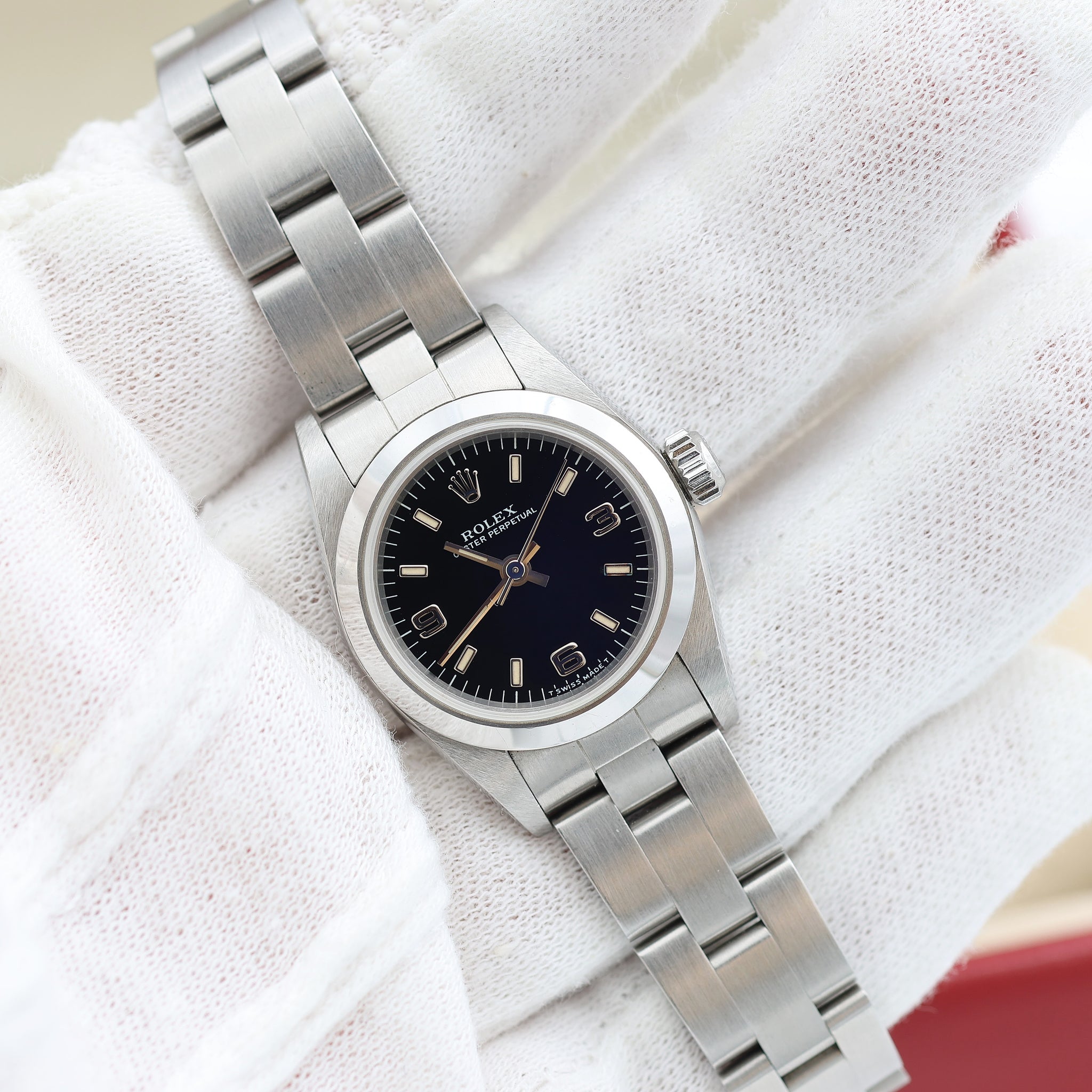 For sale at Debonar Watches: pre-owned Rolex Oyster Perpetual lady ref. 67180 with a deep black dial with 3-6-9 numerals.