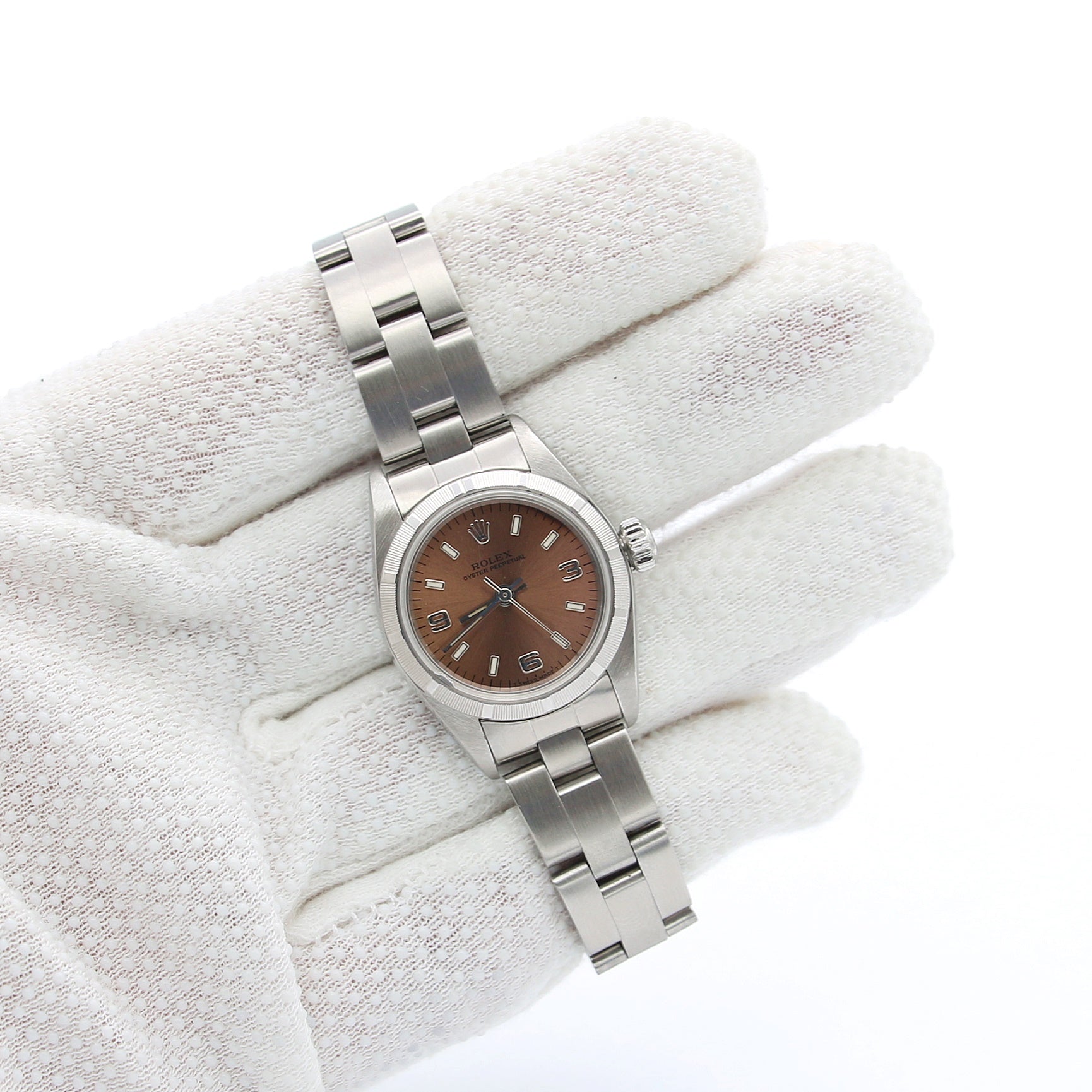 For sale at Debonar Watches: pre-Owned Rolex Oyster Perpetual ref. 67230, automatic watch, features a 26mm stainless steel case surrounding a salmon dial with. 3-6-9 numerals.