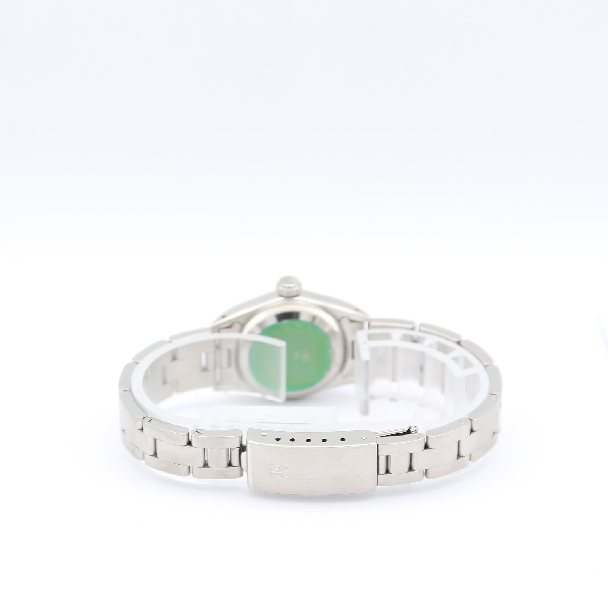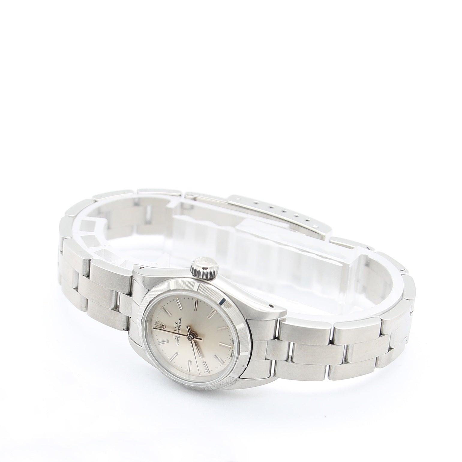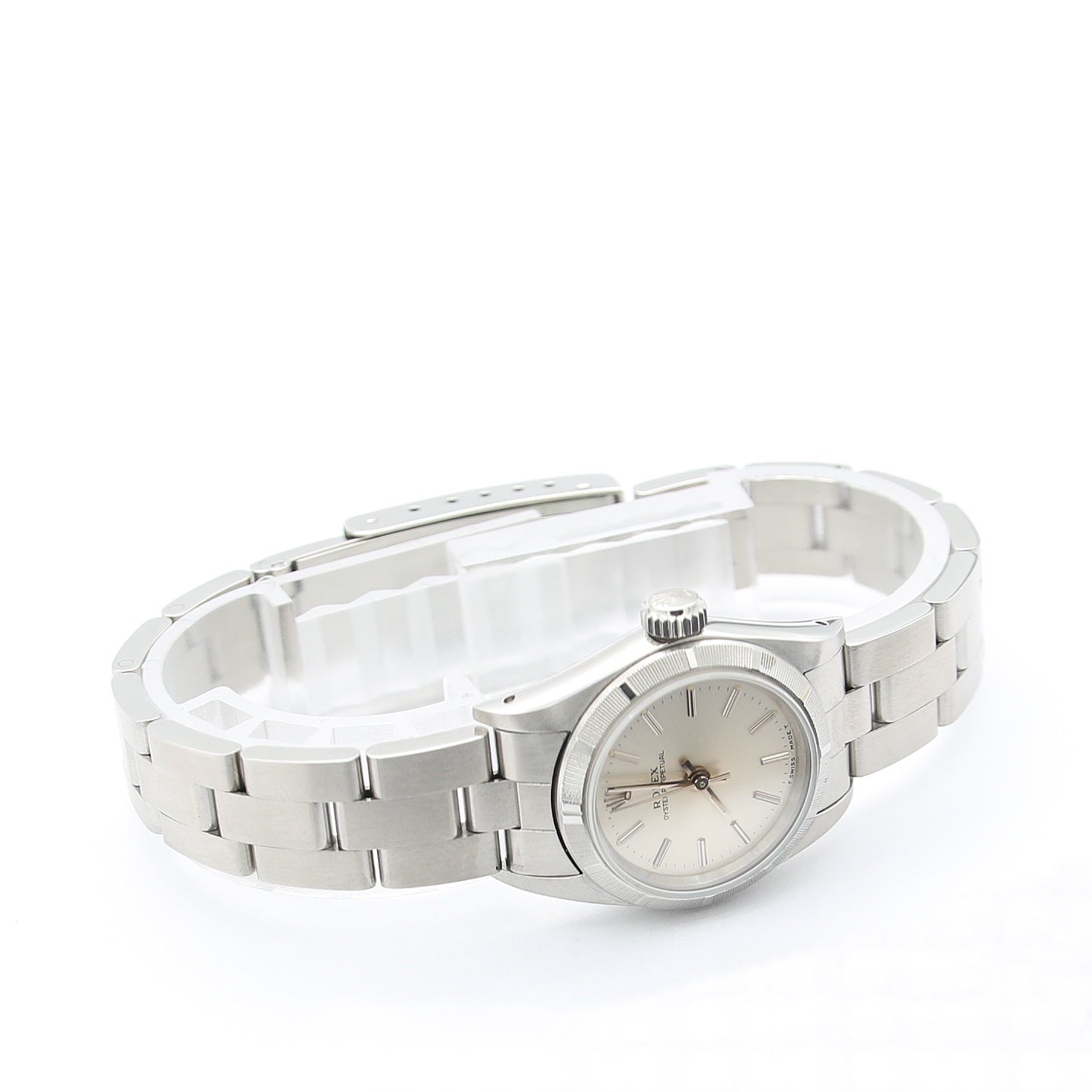 This Roles is on a stainless steel Oyster bracelet with folding buckle.