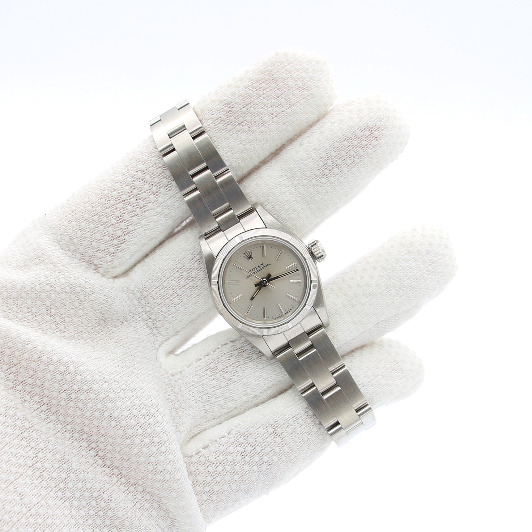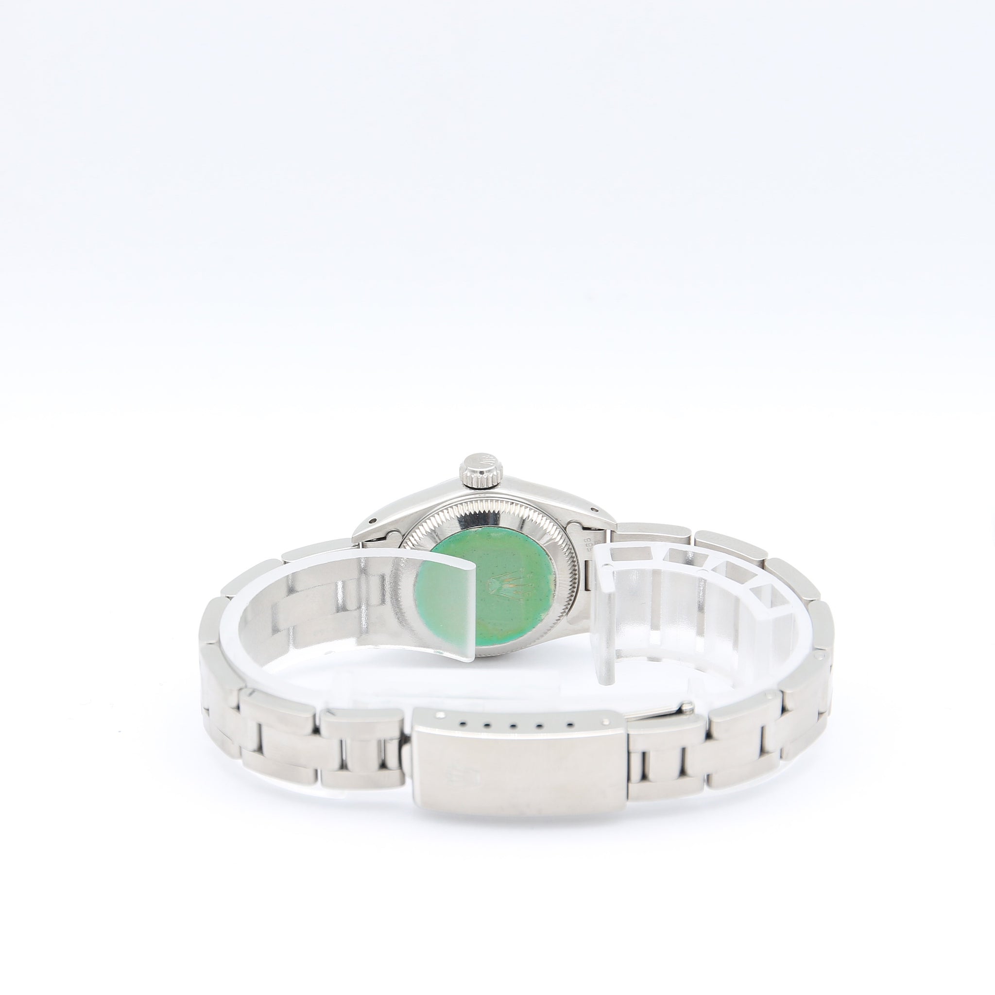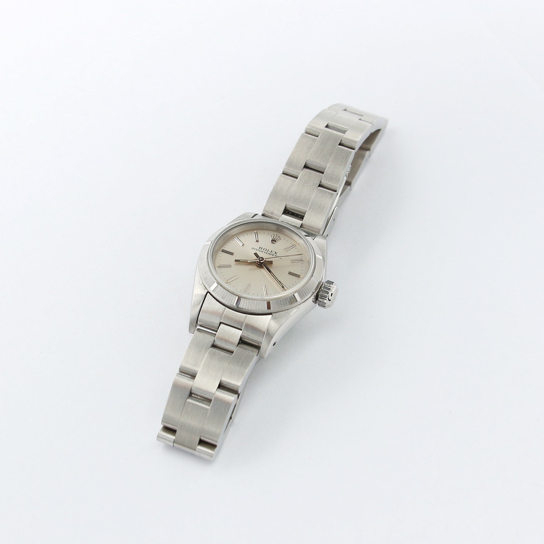 This Roles is on a stainless steel Oyster bracelet with folding buckle.