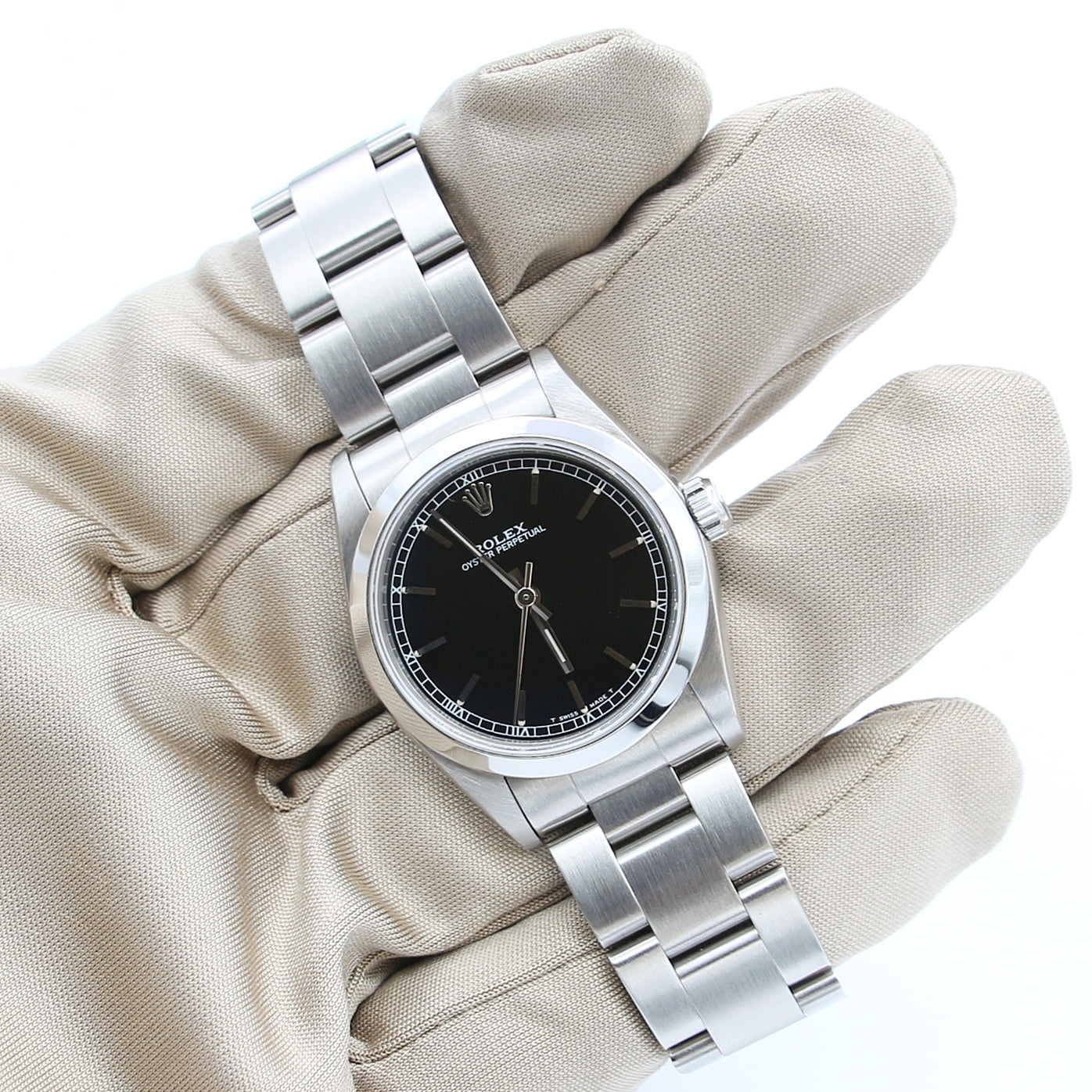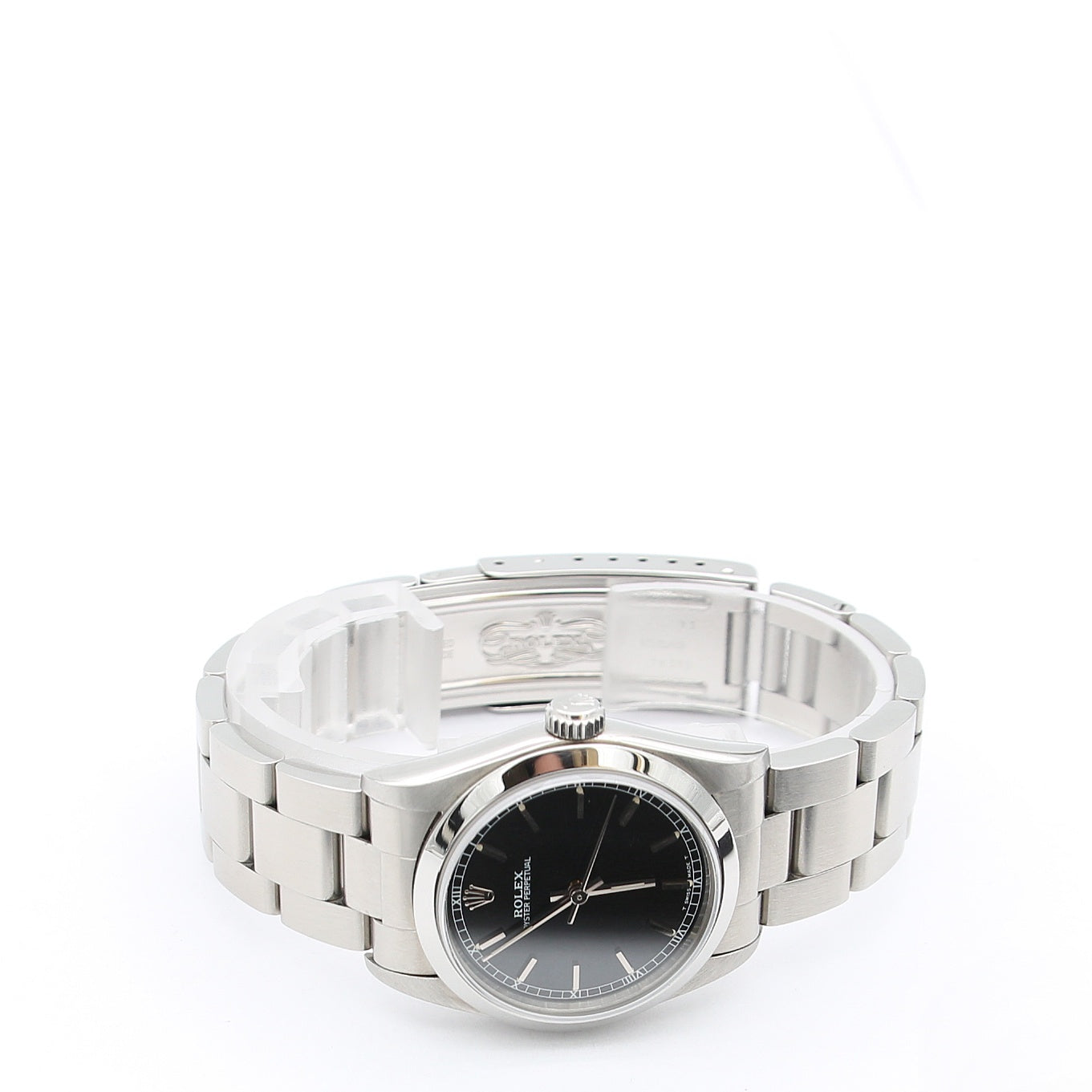 Sized at the uncommon 31mm diameter, it is just above the traditional women's Oyster Perpetual sizing of 26 (later 28mm), and just below the famed 36mm sizing of the classic model.