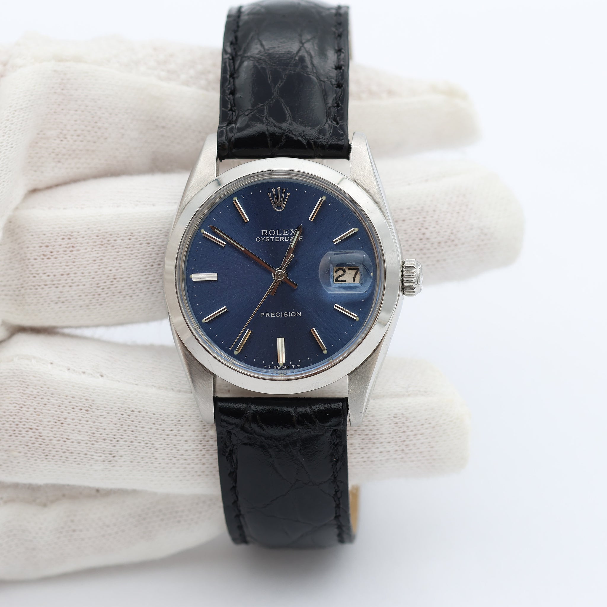 For sale at Debonar Watches: pre-owned Rolex Precision Date ref. 6694 from the '70s, with a deep blue dial, on a generic leather strap.