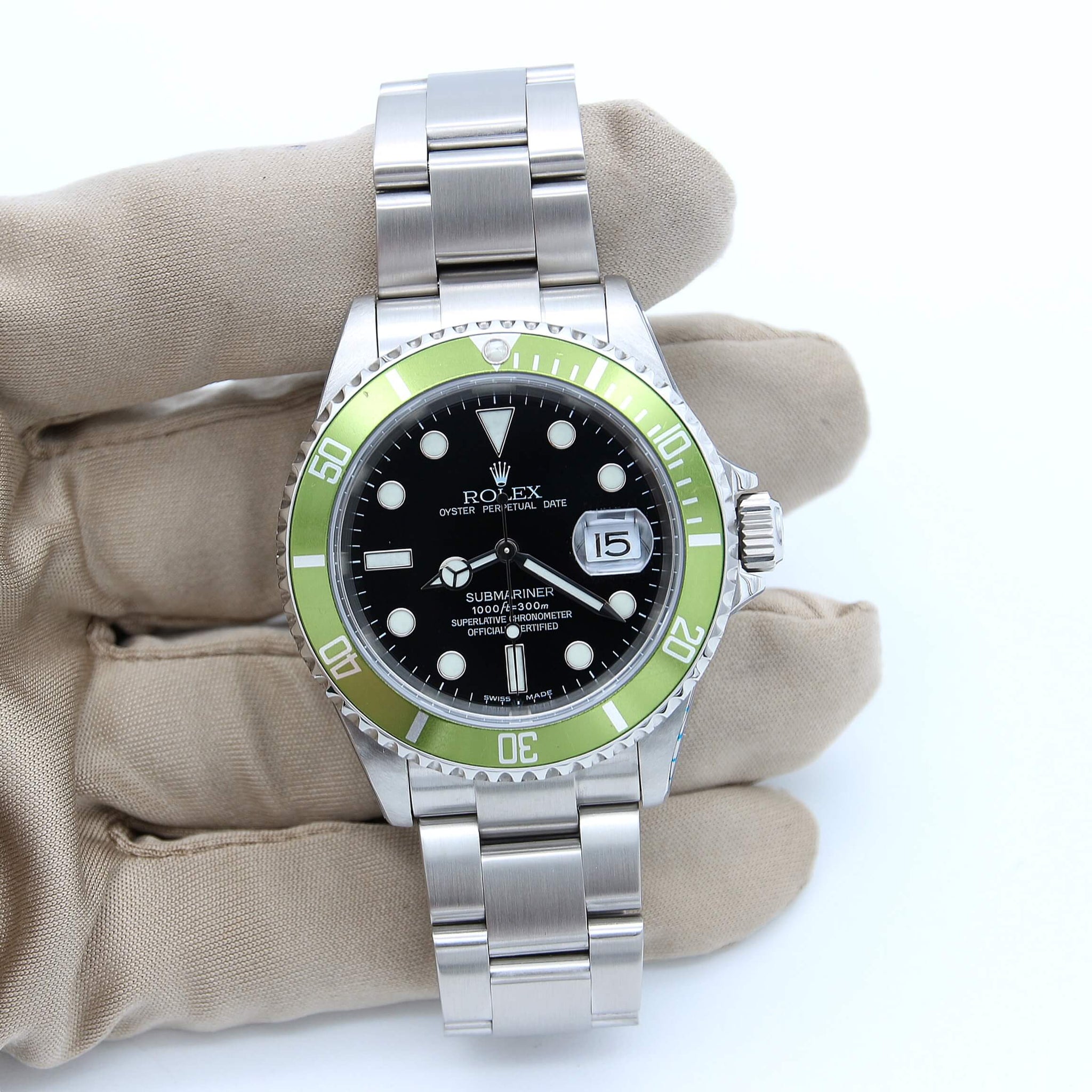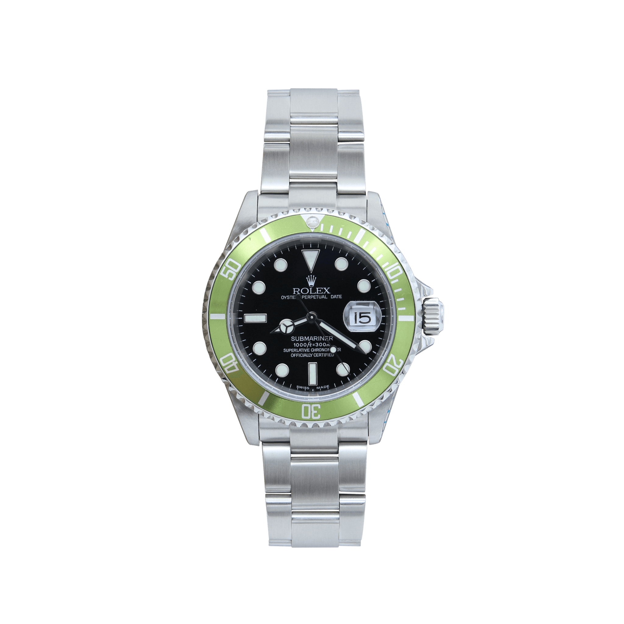 This watch, often known as "Kermit Flat 4" (or "Kermit Fat 4"), present a distinctive green bezel.