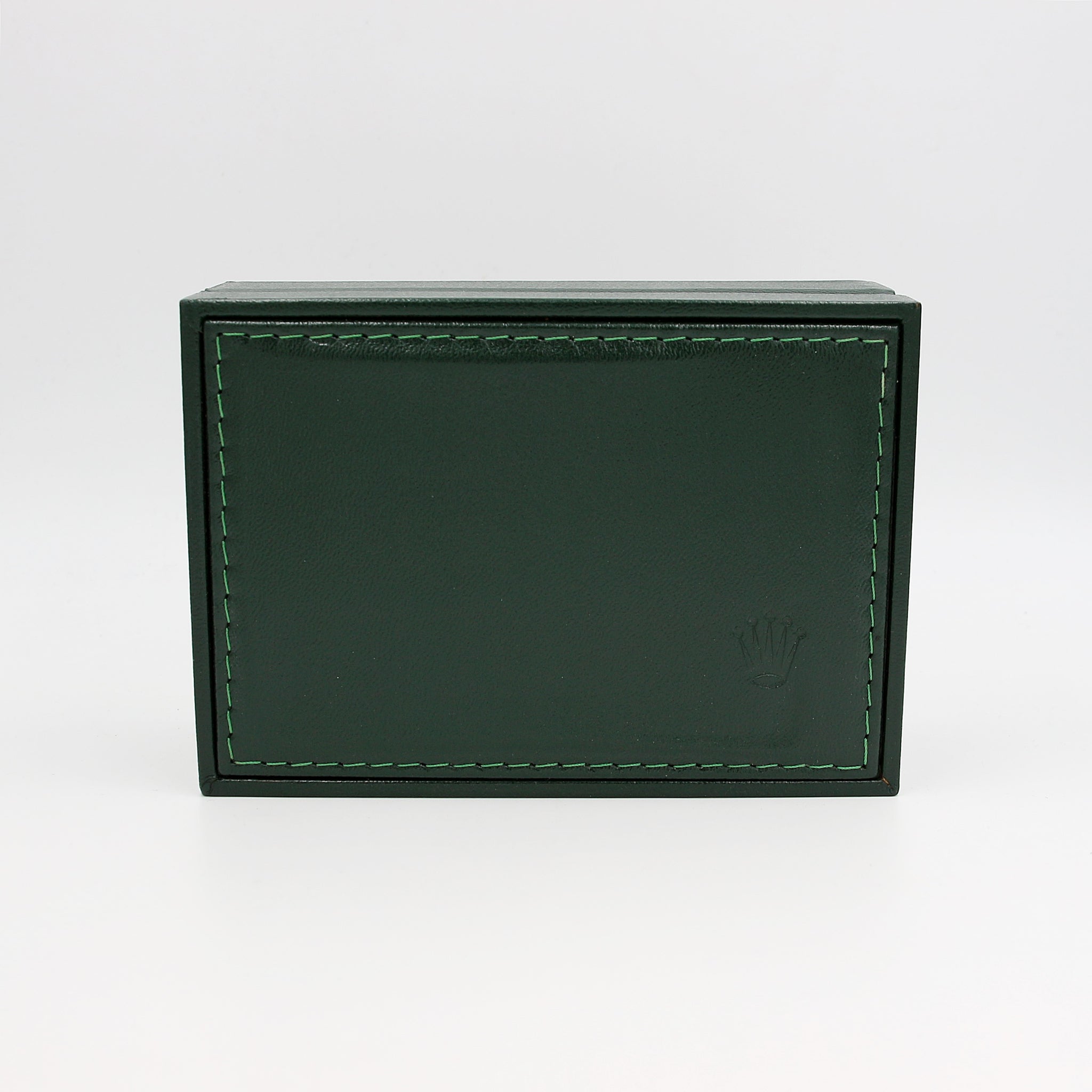 Rolex box featuring green lid design with light green stitching details and Rolex "coronet" logo embossed in the leather.